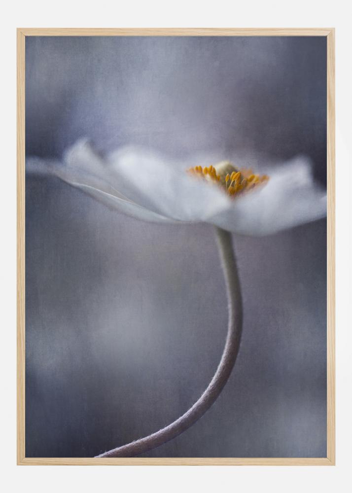 Une affiche florale représentant un gros plan d'une fleur blanche sur un fond gris doux. Le centre orange de la fleur se détache de l'arrière-plan discret, créant un point focal lumineux. La beauté de la fleur est soulignée à l'intérieur comme à l'extérieur. Éthérée et magique, elle respire la paix.
