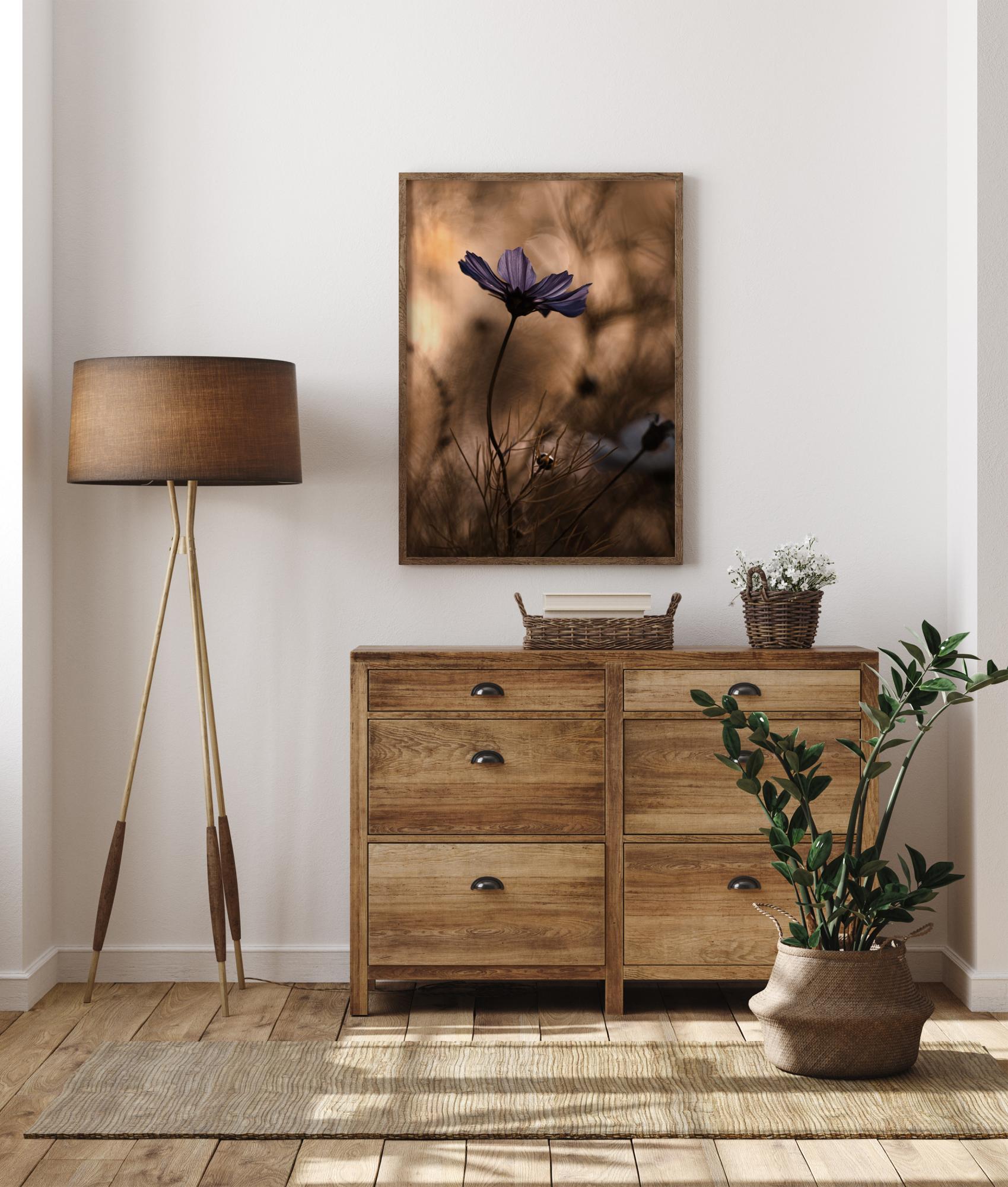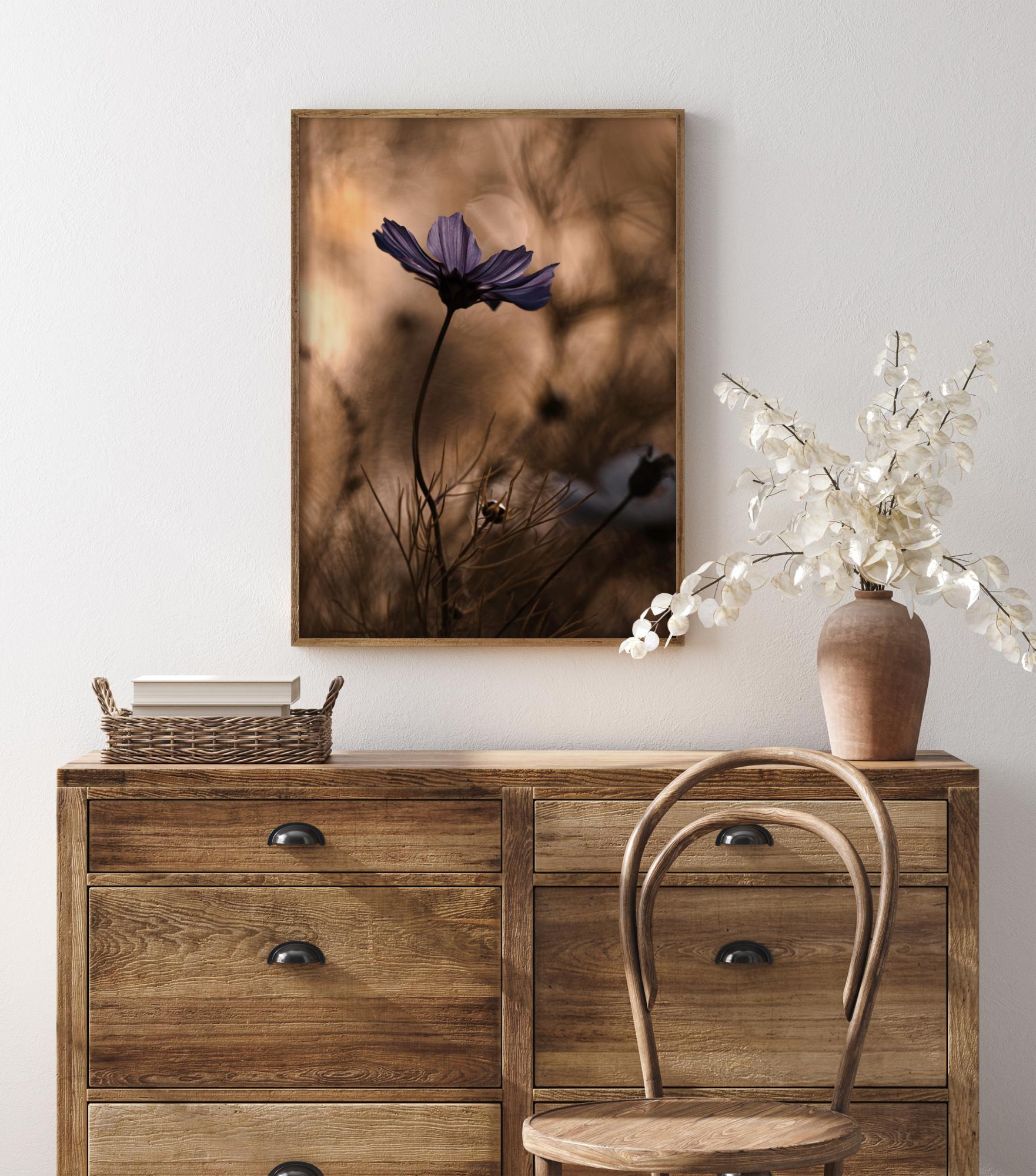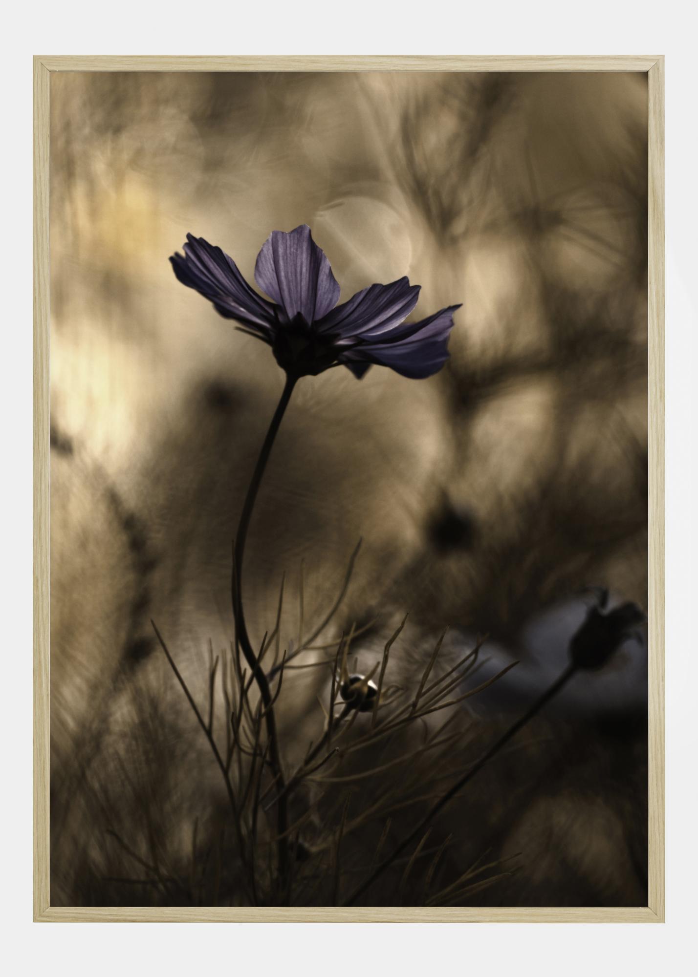 Une affiche florale représentant une fleur violette se balançant sur un fond brun doux. Les pétales violets sont mis en valeur de façon spectaculaire par rapport aux plantes floues de l'arrière-plan. D'autres formes sont visibles lorsque l'œil se déplace le long des tiges incurvées pour apprécier l'image dans son ensemble.