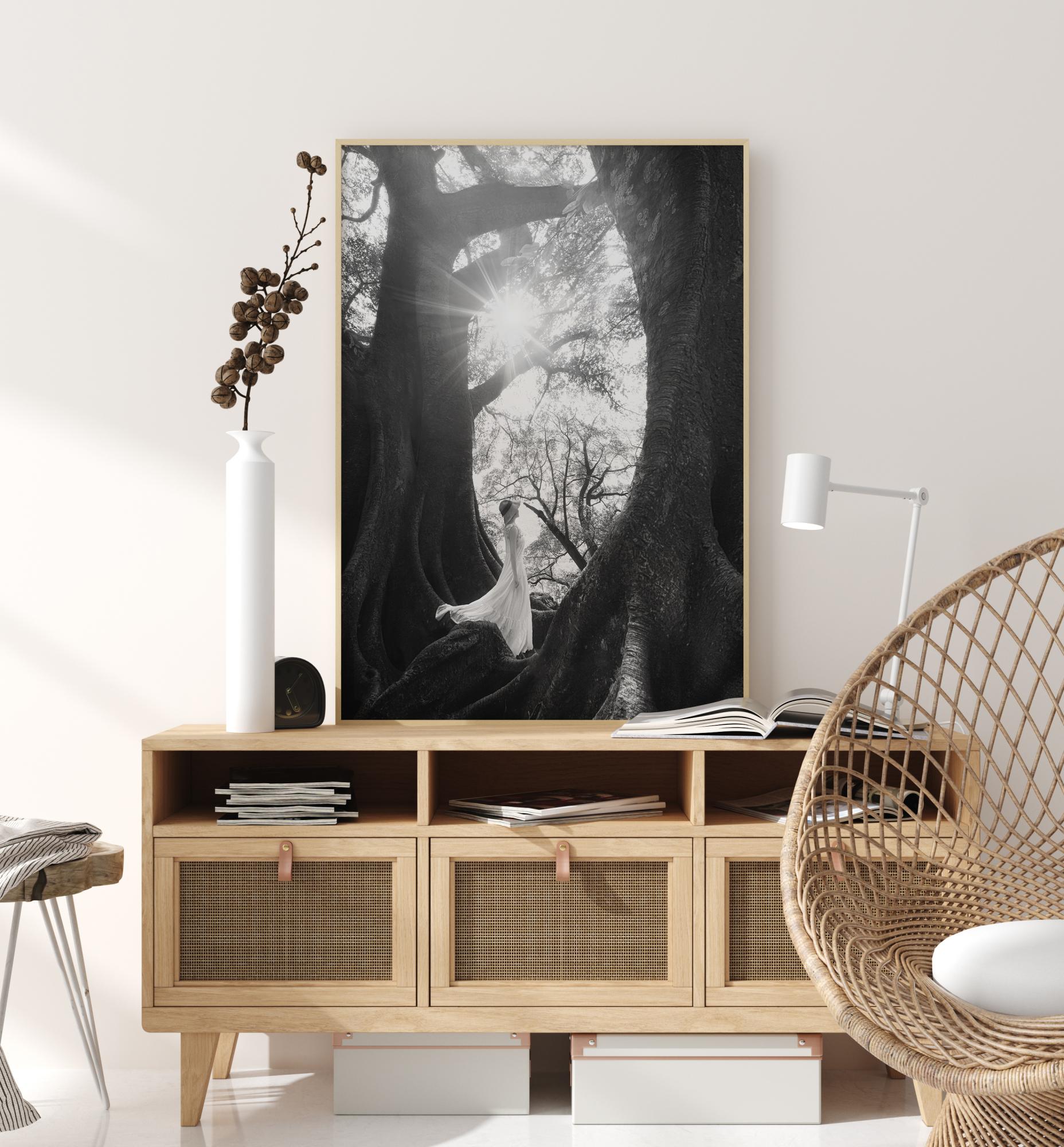 Une superbe affiche sur la nature avec des arbres immenses, un rayon de soleil et une femme qui se tient entre les deux. Le rayon de lumière vous attire dans ce cliché mystique. Paix et tranquillité dans votre maison.