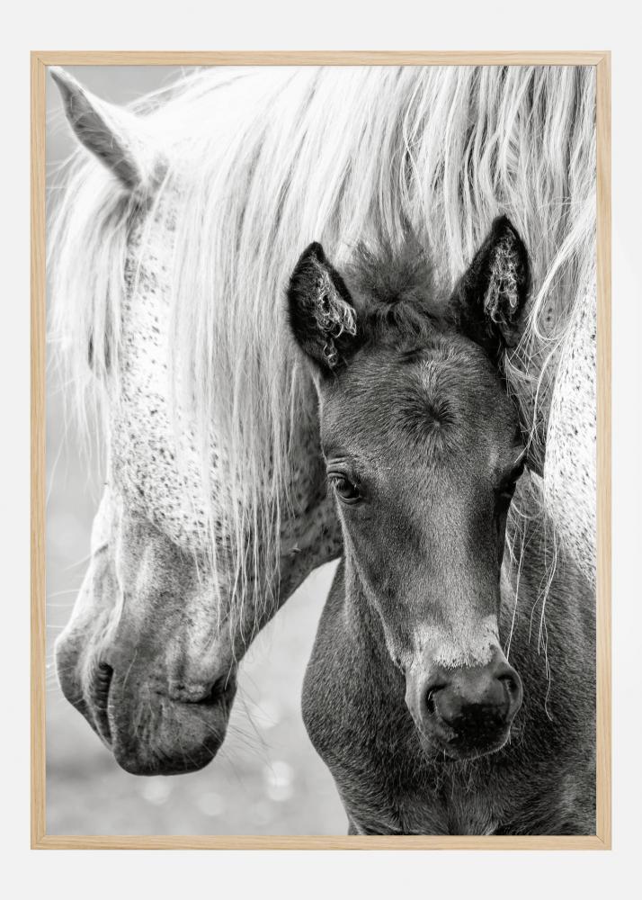 Une affiche animalière représentant une jument et son poulain. La jument protège son bébé, en penchant sa tête blanche sur son dos. Le poulain de couleur sombre regarde l'appareil photo, les oreilles dressées vers l'avant en signe de curiosité. Profitez de cette image de bébé mignon.