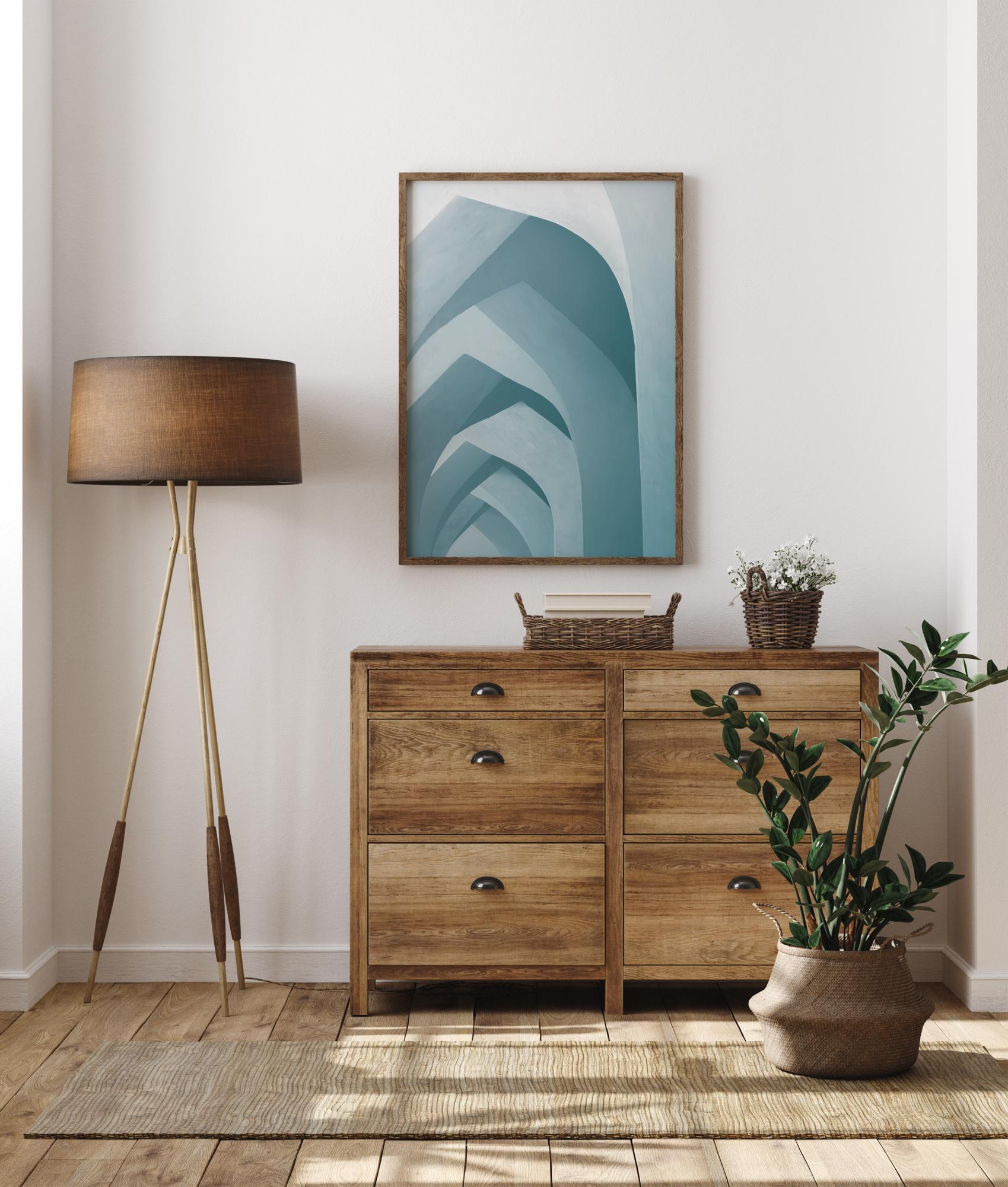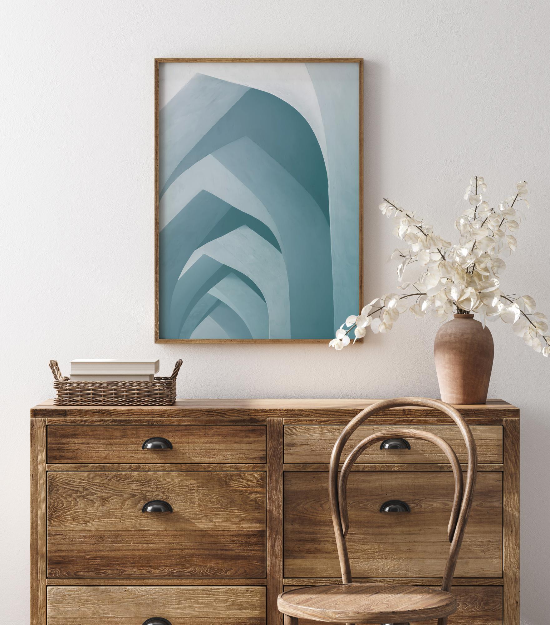 Une affiche graphique de différentes formes créant des arcs. Chaque forme d'arche est créée par l'utilisation de blocs de couleurs dans différents tons de bleu. Les couleurs sombres et claires se juxtaposent pour donner l'illusion de la profondeur et l'impression d'un long couloir. Ajoutez à ça un mur blanc pour rendre ces couleurs encore plus contrastées.