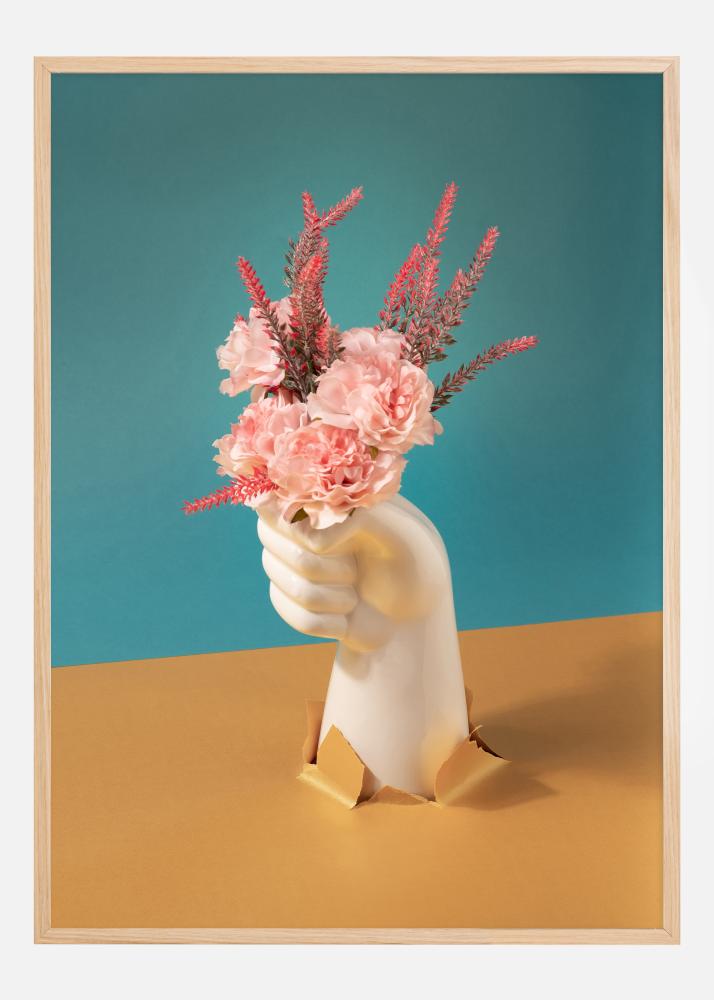 Ce poster créatif et ingénieux représente une main sculpturale tenant un bouquet de fleurs épanouies, créant l'illusion d'un vase. L'arrière-plan dans des tons bleus apaisants contraste magnifiquement avec les couleurs chaudes jaunes et roses, créant une sensation fraîche et contemporaine. La composition divisée avec la main traversant la surface jaune ajoute un élément de dynamique et d'illusion tridimensionnelle à l'image.