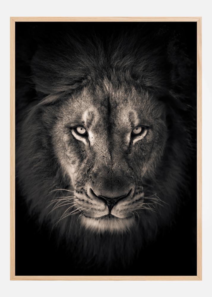 Cette affiche puissante et captivante capture le regard profond d'un lion, évoquant une sensation de sa force et de sa présence. La tonalité en noir et blanc confère à l'image une qualité intemporelle et met en valeur les traits majestueux du lion et l'intensité qui se trouve dans ses yeux. C'est une impression qui dégage autorité et la nature sauvage, une représentation idéale du 'roi de la jungle'.