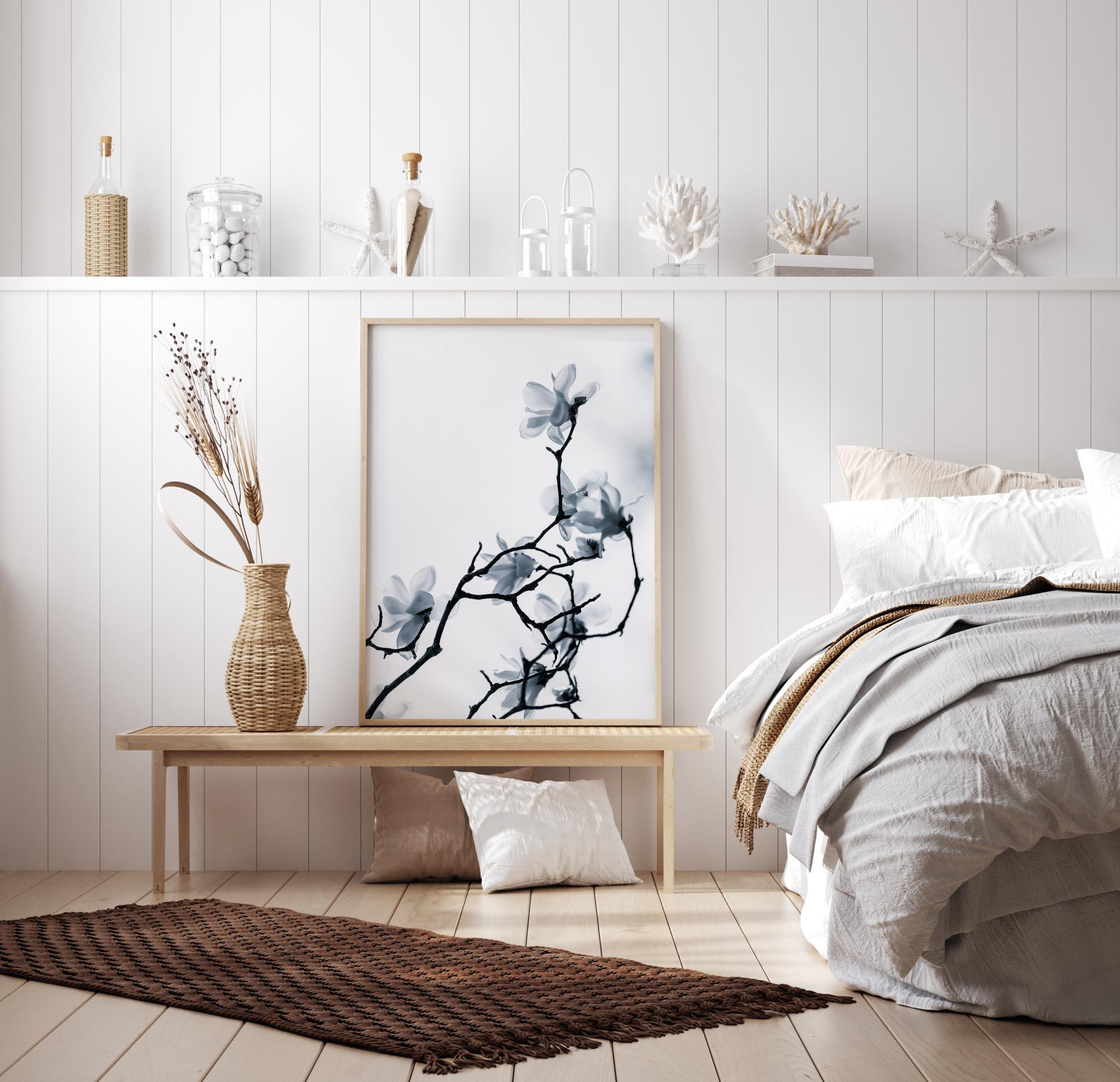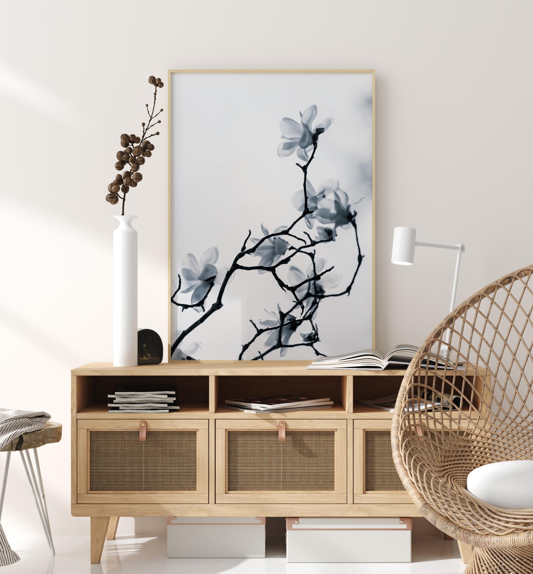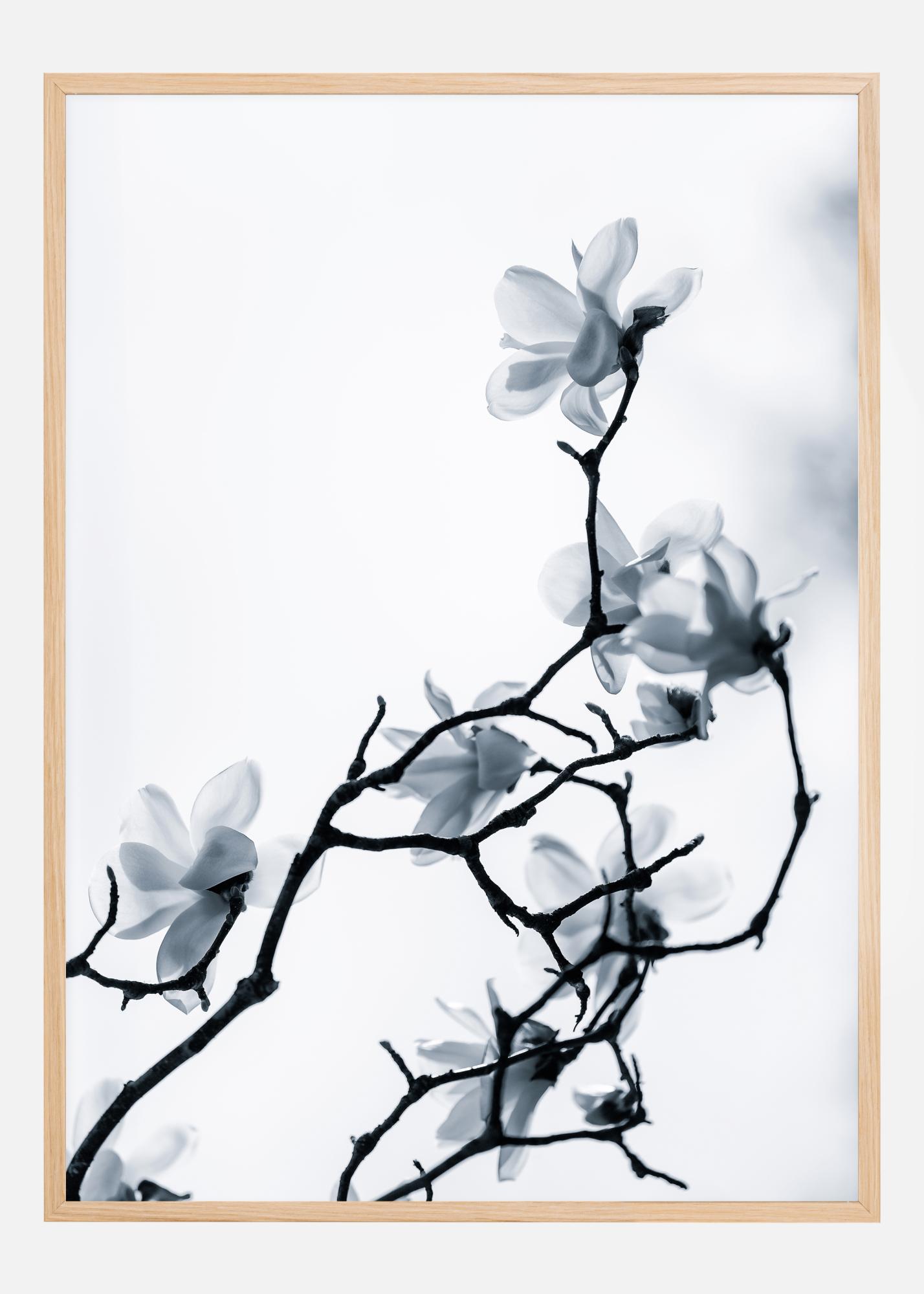 Un poster floral d'une blancheur unique pleine de fleurs douces. Noirs sur fond de ciel blanc, les fines branches s'étirent vers le haut, chacune tenant une douce fleur blanche. La sérénité et le calme se dégagent de cette image, qui conviendrait parfaitement à une salle de bains ou à un simple mur d'entrée.