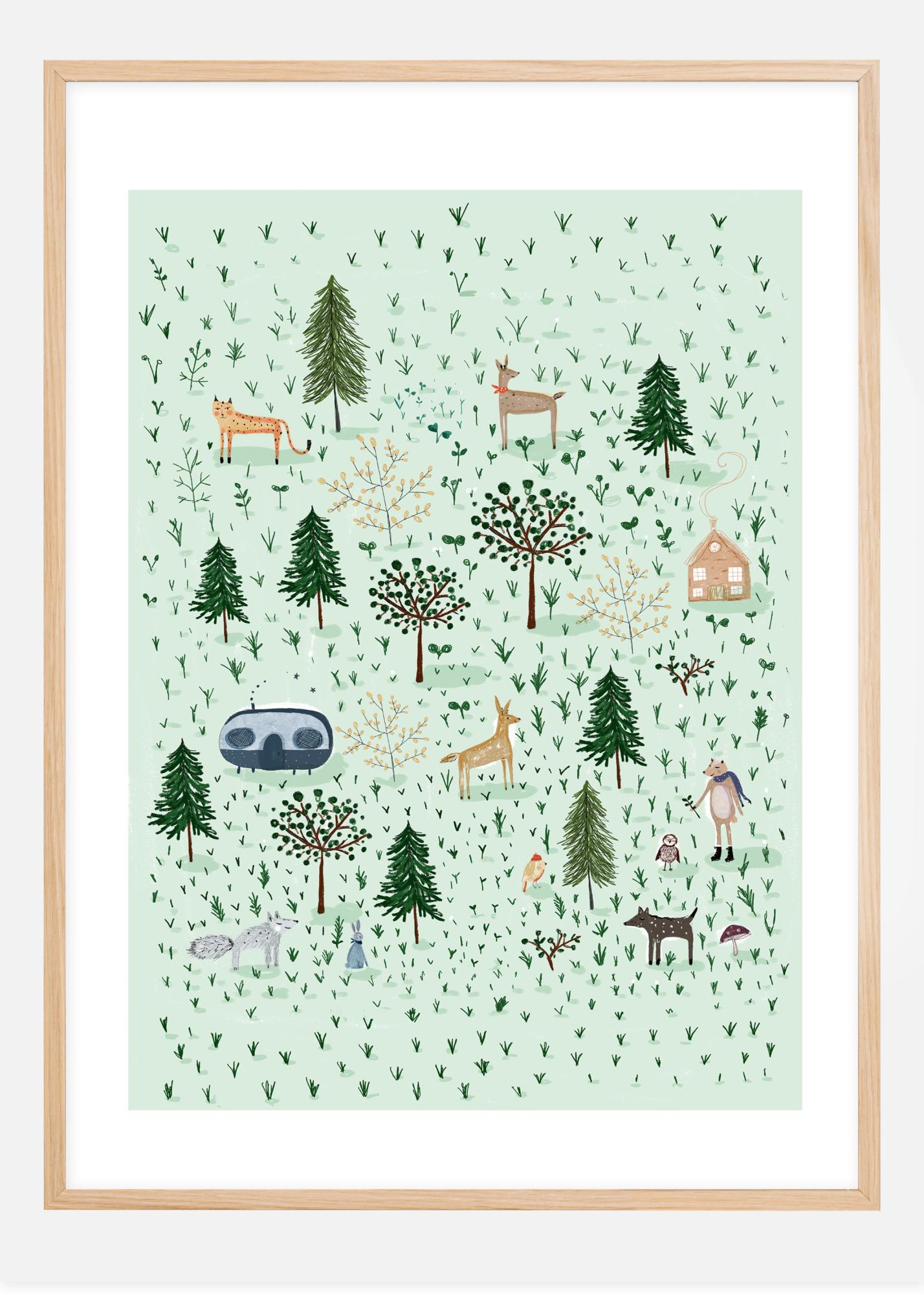 C’est une affiche amusante d'une petite forêt principalement. Elle est remplie de différents animaux. Il s'agit d'un dessin graphique avec des arbres simplifiés, des animaux et des maisons éparpillés. Rien n'est à l'échelle. Il y a un grand renard debout avec une écharpe et des bottes, une petite maison et une énorme caravane. C'est mignon et ça fait penser à une carte de Noël. Une belle addition à tout espace de vie.