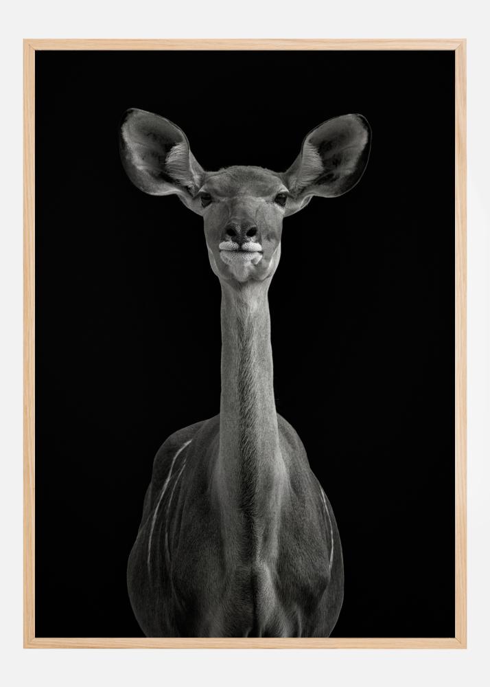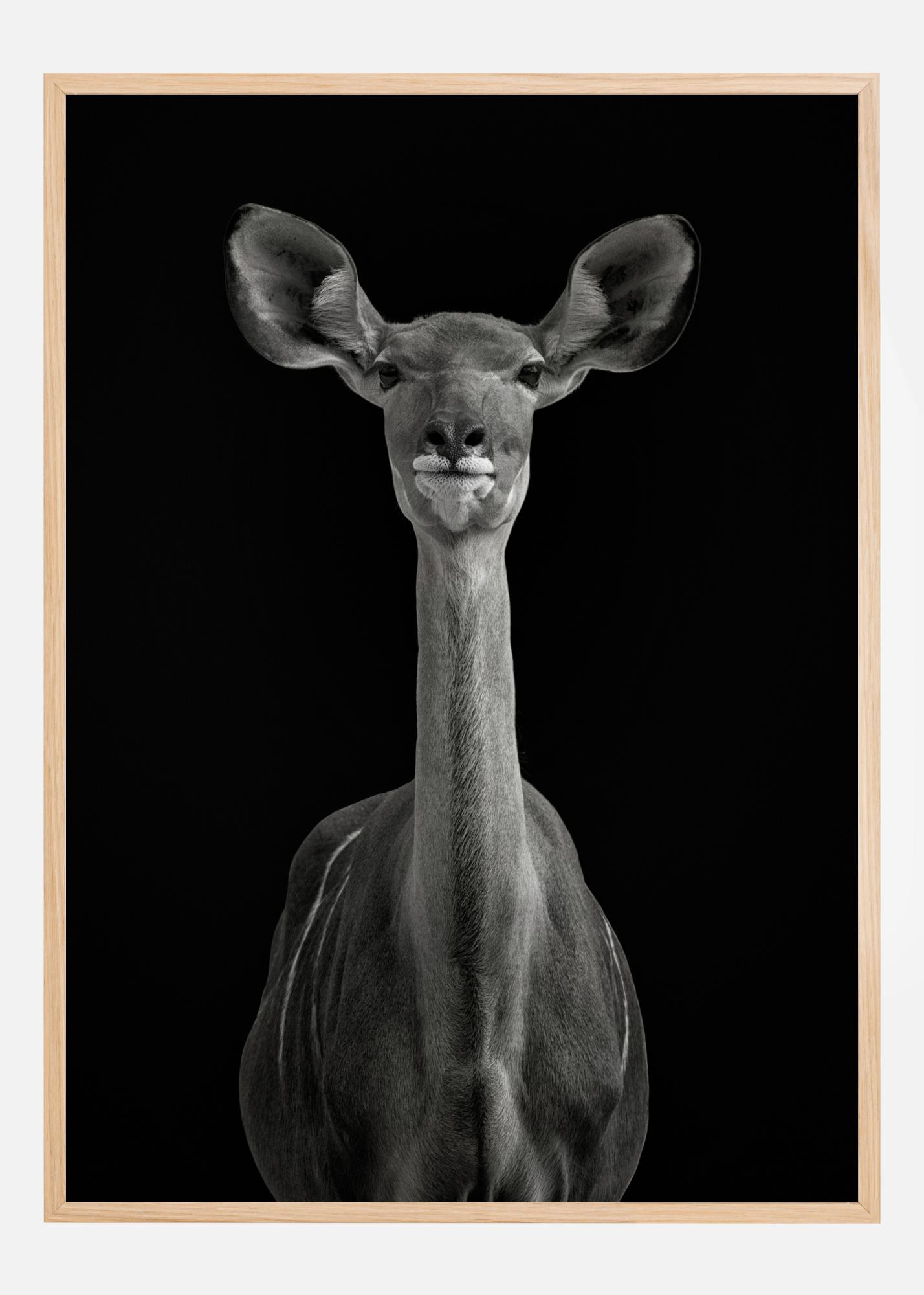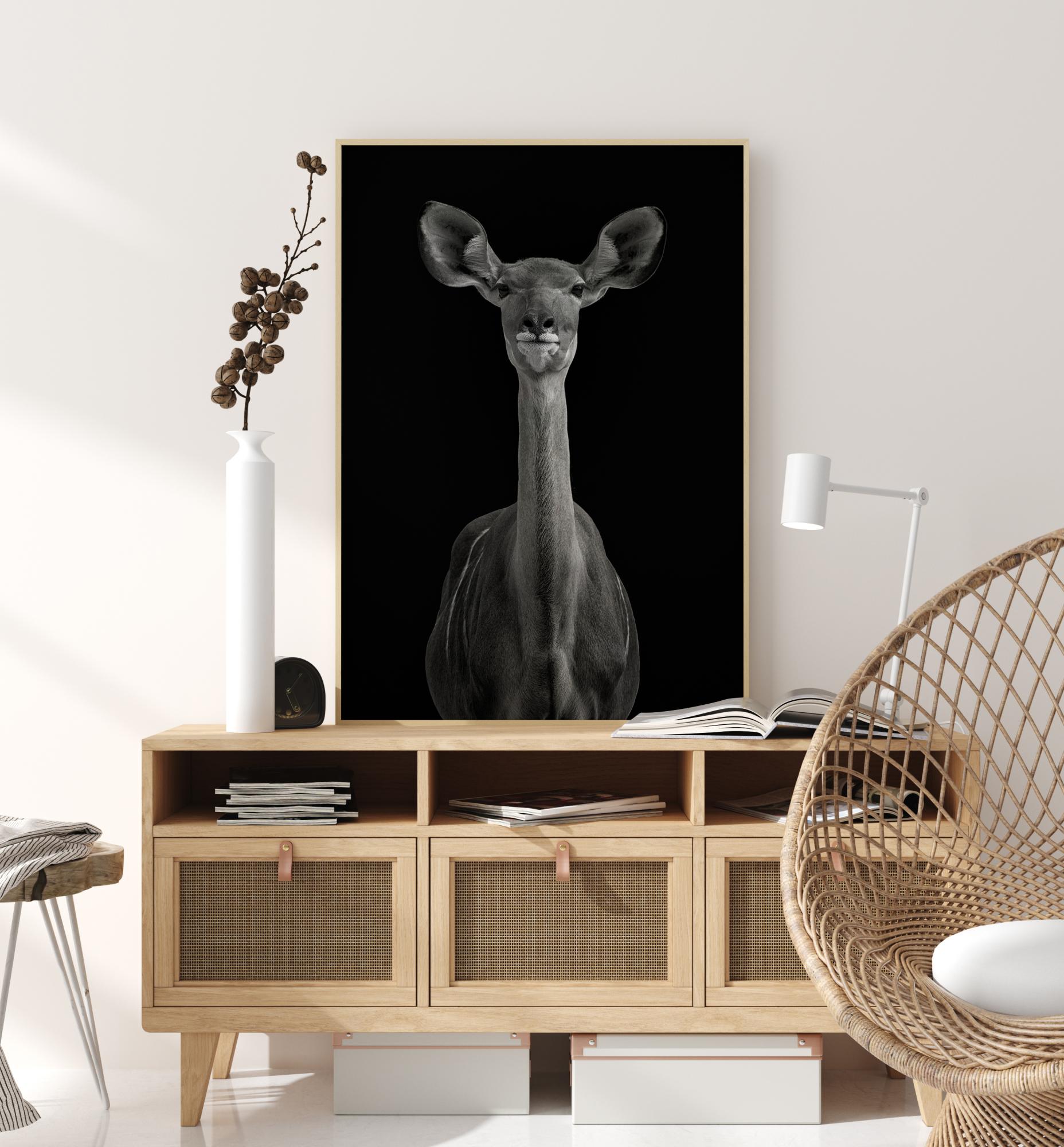 C’est un portrait étonnant d'une antilope sur un fond noir. La biche fait face à l'appareil photo, les oreilles dressées vers l'avant alors qu'elle regarde et écoute. Son cou est long et fin, ses yeux doux. Associez-la à un autre imprimé animalier pour créer une ambiance zoologique étonnante sur vos murs.