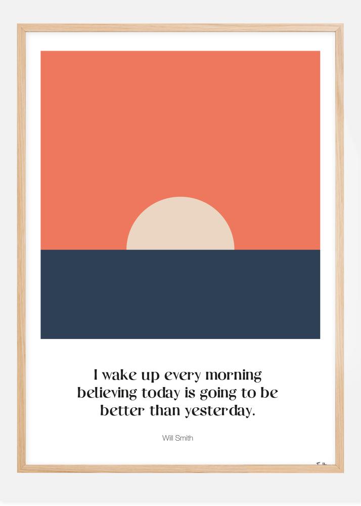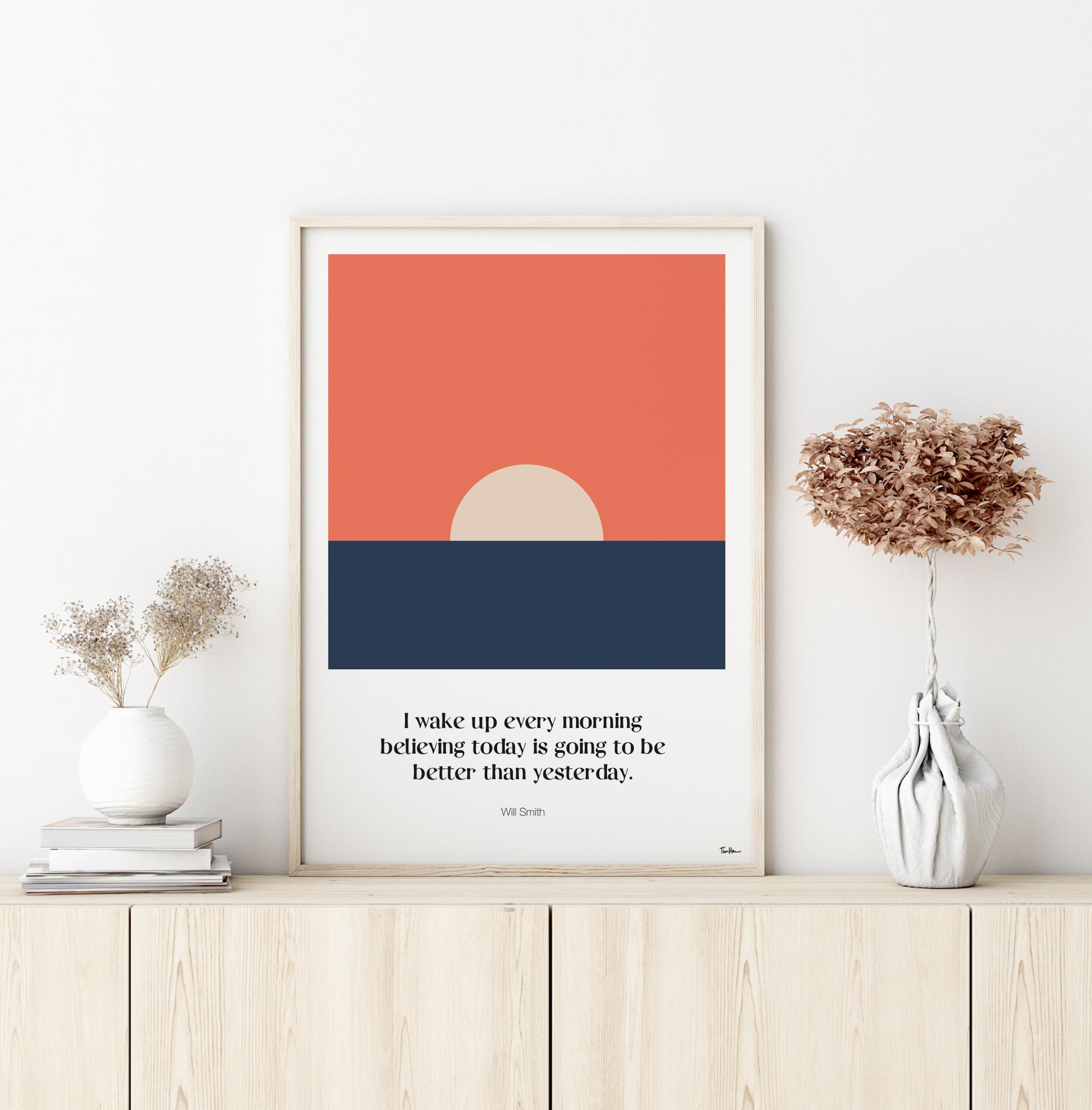 Un poster avec une citation de Will Smith "Je me réveille chaque matin en croyant que aujourd'hui sera meilleur qu'hier" écrite sous une illustration graphique d'un lever de soleil. Un poster élégant et épuré créé par Tim Hansson.