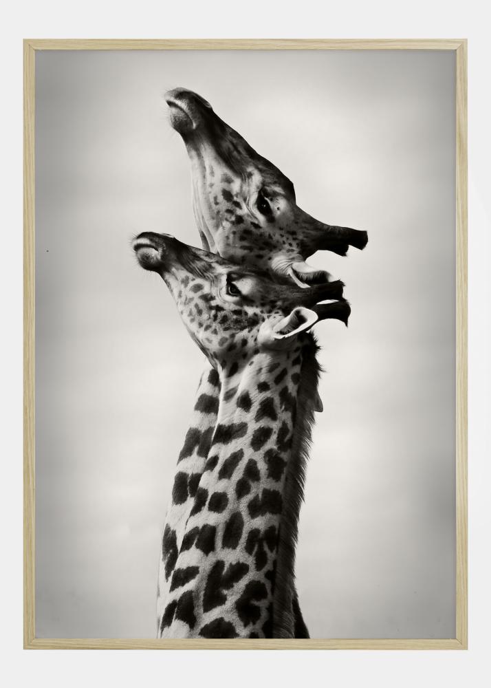 Le poster montre un moment charmant entre deux girafes qui semblent partager une interaction tendre, leurs cous élégamment courbés l'un vers l'autre. L'image est capturée en noir et blanc, ce qui renforce les motifs iconiques sur la peau des girafes et crée un fort contraste visuel contre le doux fond du ciel.