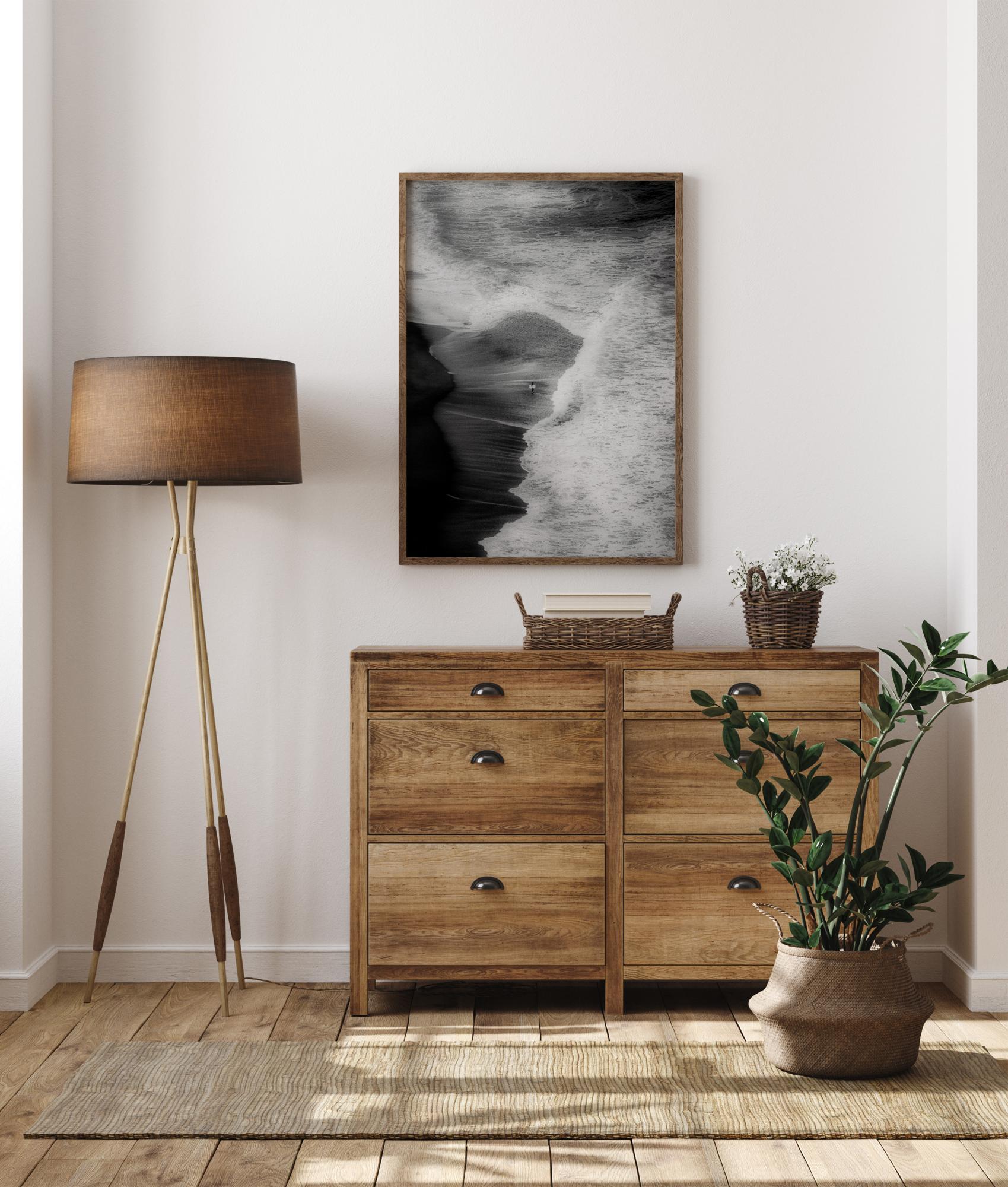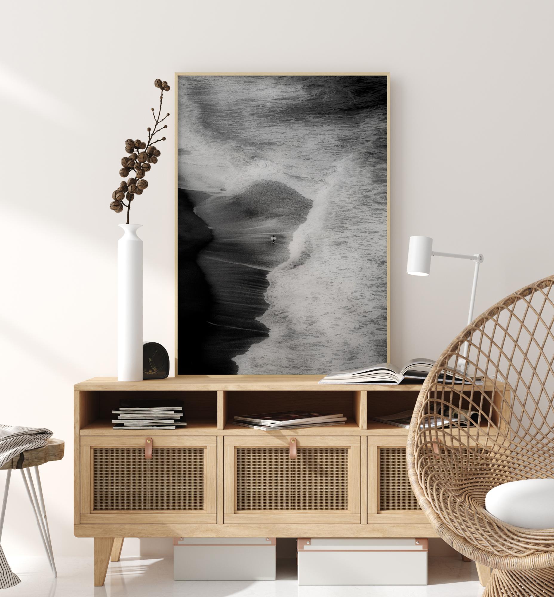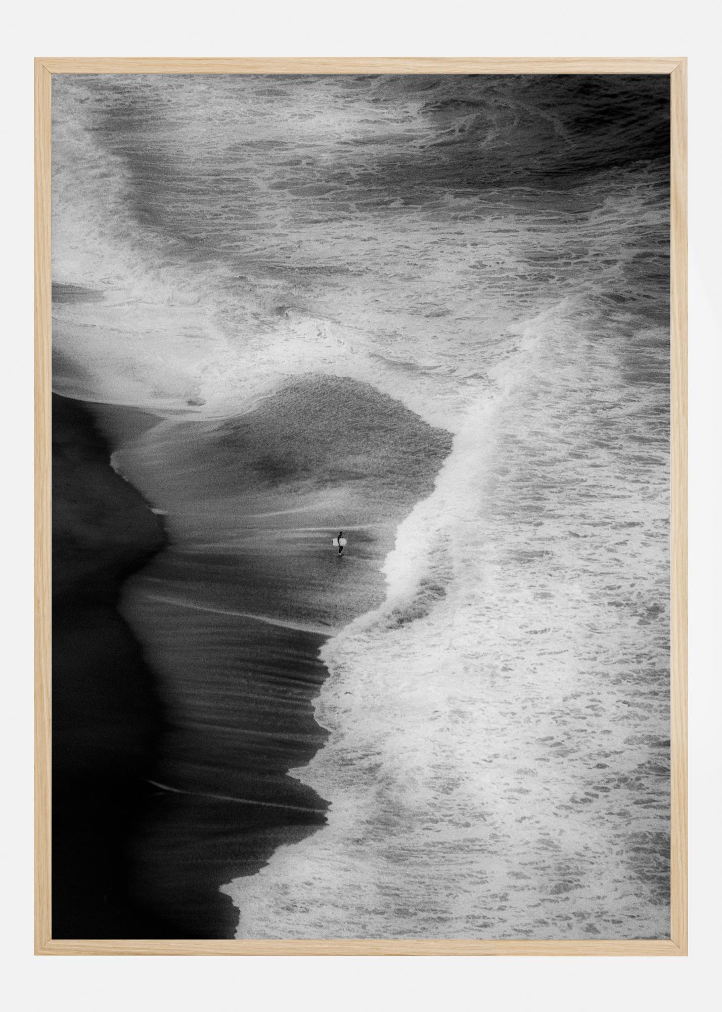 Une affiche aérienne d'une plage et d’un surfeur. Cette image abstraite montre la magnificence de la nature lorsque les vagues atteignent la plage - le surfeur solitaire constituant le point focal de l'image.