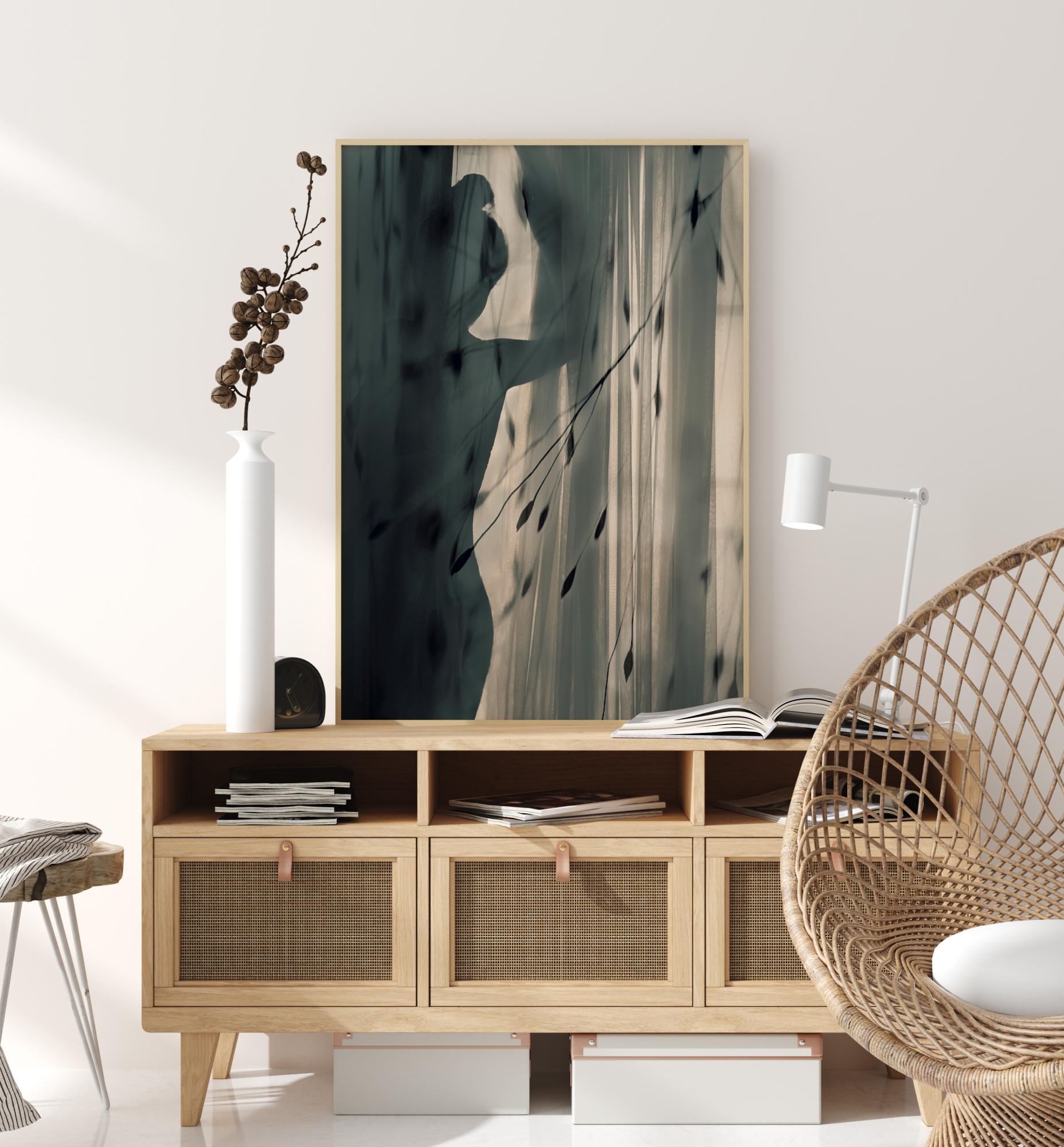 Une affiche portrait d'une personne qui regarde le monde extérieur à travers un rideau. Le tissu doux et translucide souffle sur l'image tandis que la silhouette de la personne s'appuie sur le cadre de la fenêtre. La lumière douce de l'extérieur éclaire la scène juste assez pour voir ce qui se passe.