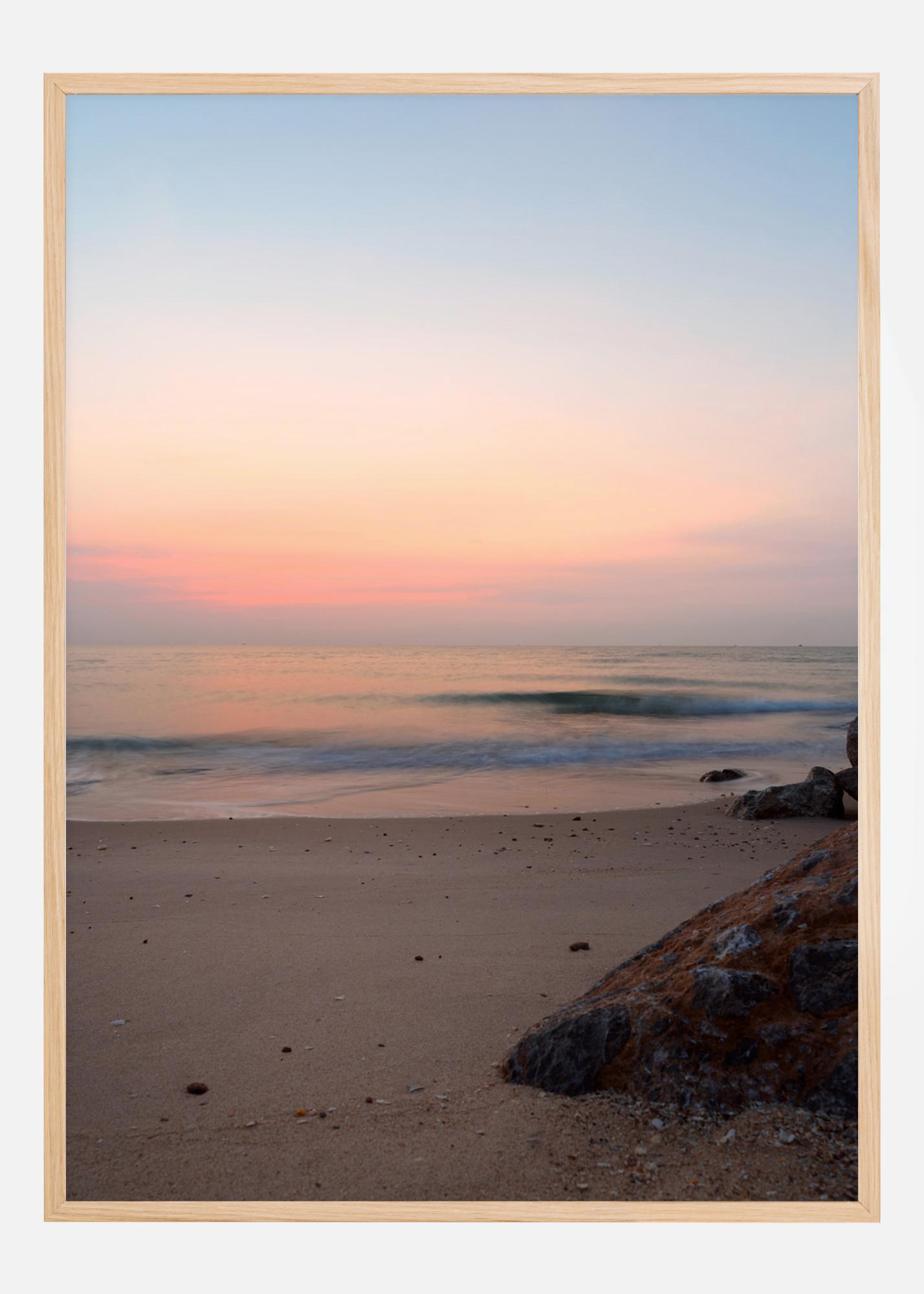 Une affiche de plage montrant une large étendue de sable avec une mer sereine en arrière-plan. Un léger lever de soleil se profile à l'horizon, projetant une douce lueur rose et bleue sur la mer. Obtenez cette ambiance de vacances avec cette scène de plage calme et tranquille.