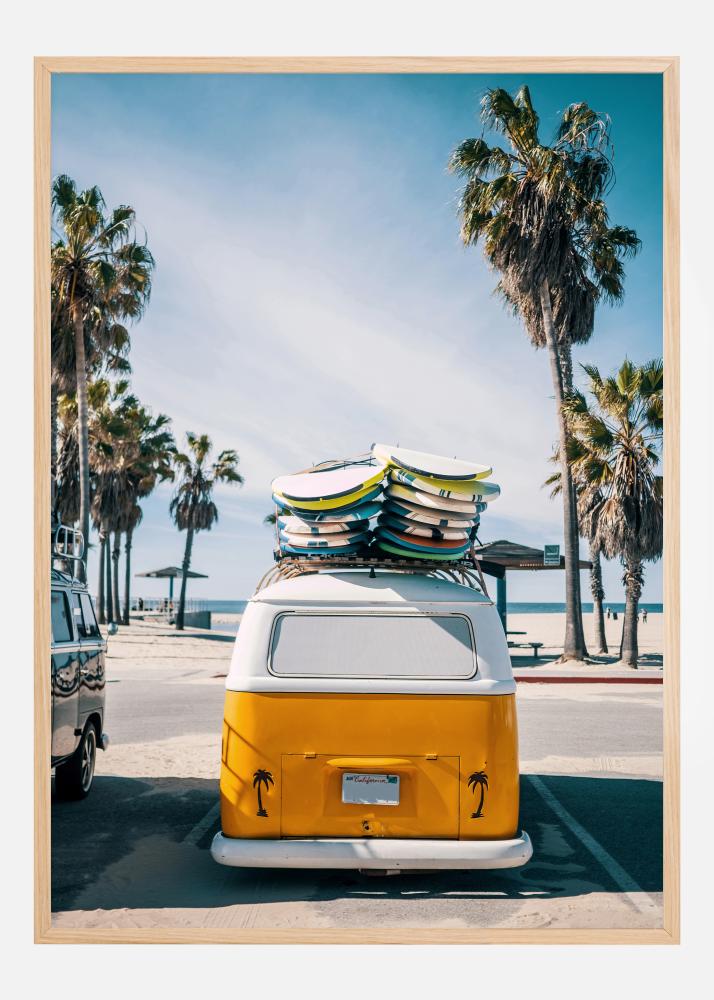 C’est une affiche de vacances amusante. Elle représente un camping-car jaune garé sur un parking près d'une plage. Des palmiers entourent le parking pour lui donner des airs de vacances. La lumière du soleil éclaire la scène et donne l'impression d'une chaude journée d'été, parfaite pour un surf rapide dans la mer sur l'une des planches de surf de la voiture.