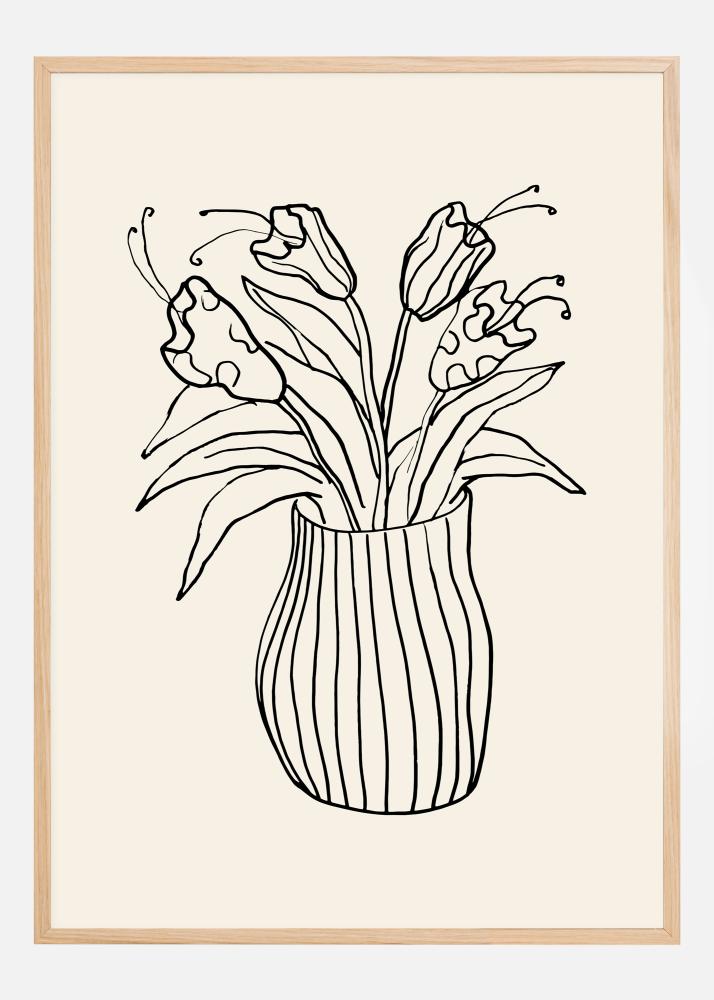 Une affiche stylisée de fleurs dans un vase. Les lignes noires fortes et audacieuses font ressortir les fleurs dans le vase. Sur un fond blanc, ces fleurs ressortent clairement. Ajoutez une touche de couleur à l'image en l'accrochant sur un mur clair et audacieux.