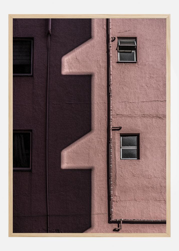 Une affiche de bâtiment représentant l'extérieur d'un immeuble rose foncé. Les ombres et la lumière projettent des formes étranges sur le côté du bâtiment. Les fenêtres ressemblent à des yeux, alignés avec les ombres qui ressemblent à des nez, de sorte que cette image semble vous regarder droit dans les yeux.
