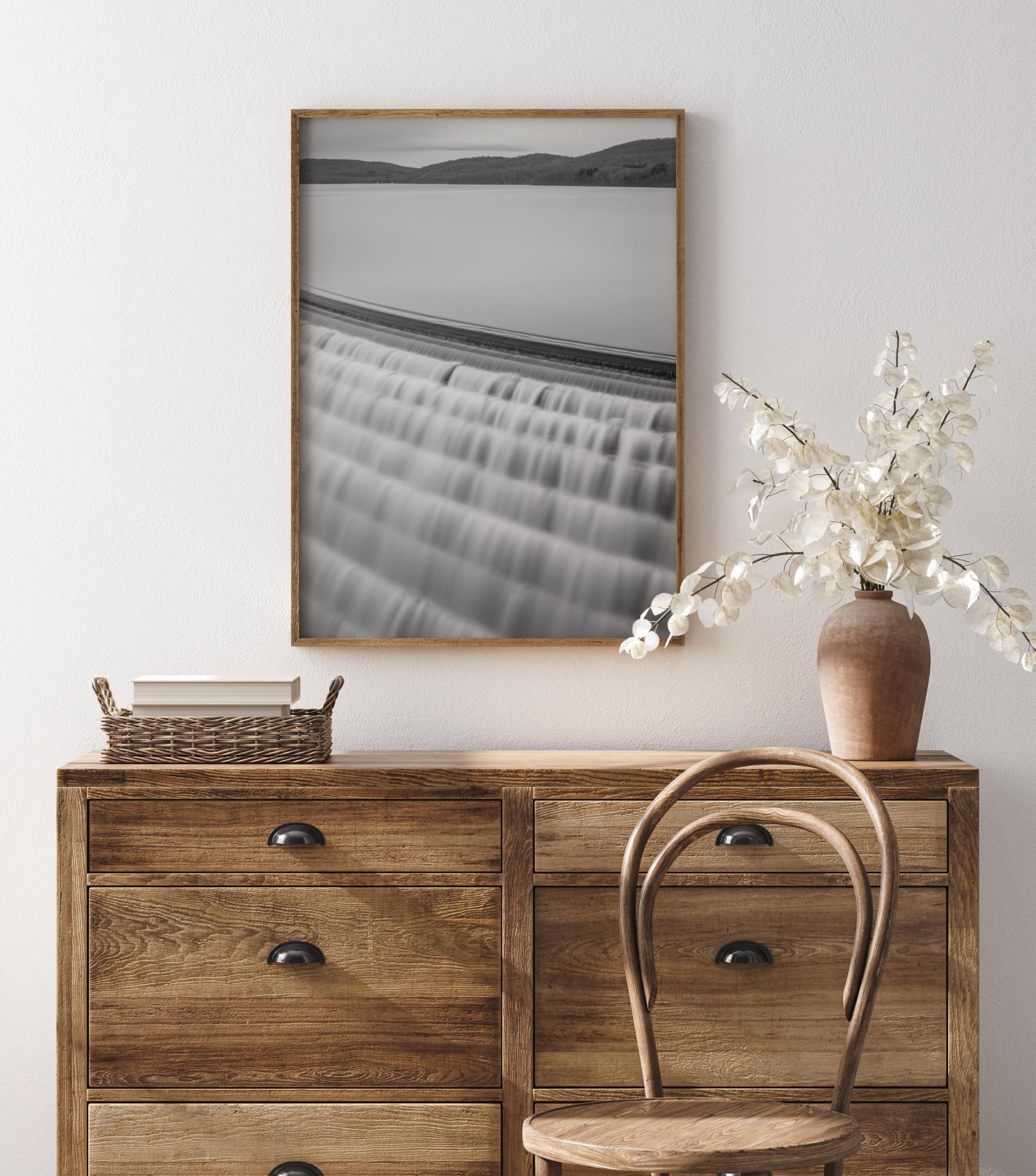 Un poster gris mettant en avant des mini-cascades dans un barrage artificiel près d'un lac. Les eaux grises immobiles s'étendent suivant les minuscules chutes d'eau qui ruissellent sur les petits rebords. Elles créent un motif en mouvement et de déplacement. Détendez-vous et laissez vos yeux suivre les courants d'eau qui s'écoulent lentement.