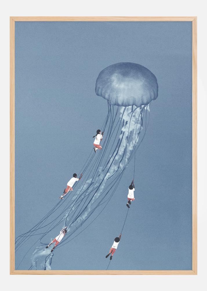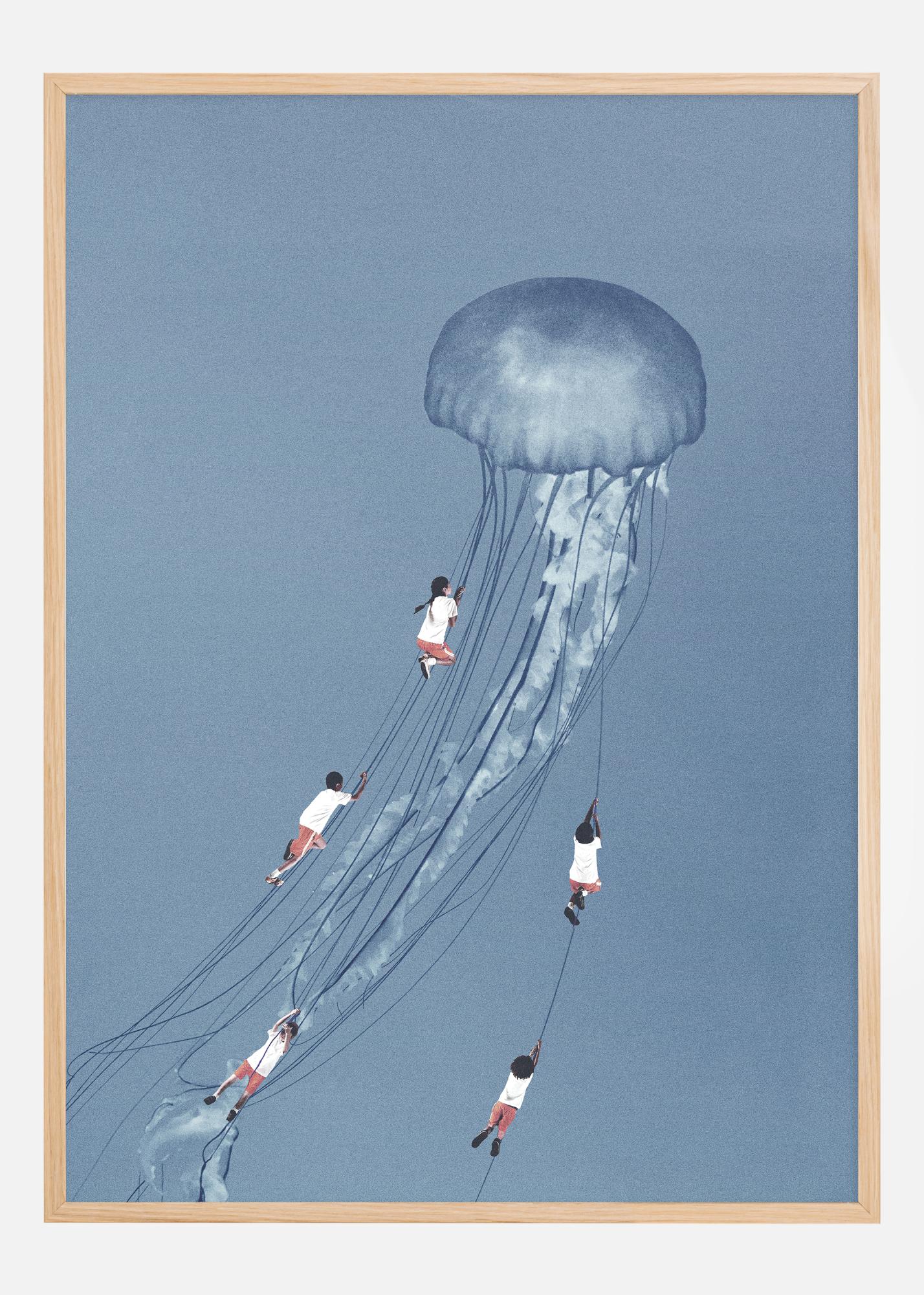 Cette affiche poétique et onirique montre des gens se balançant sur les tentacules d'une méduse géante, flottant dans un ciel bleu infini. Cette scène fascinante est un hommage à la puissance de l'imagination, où l'inconscient et le monde des rêves se heurtent à la réalité éveillée. La danse en apesanteur des personnes avec la méduse symbolise la joie, la liberté et la facilité décontractée qui se trouvent souvent dans les mondes ludiques des enfants.