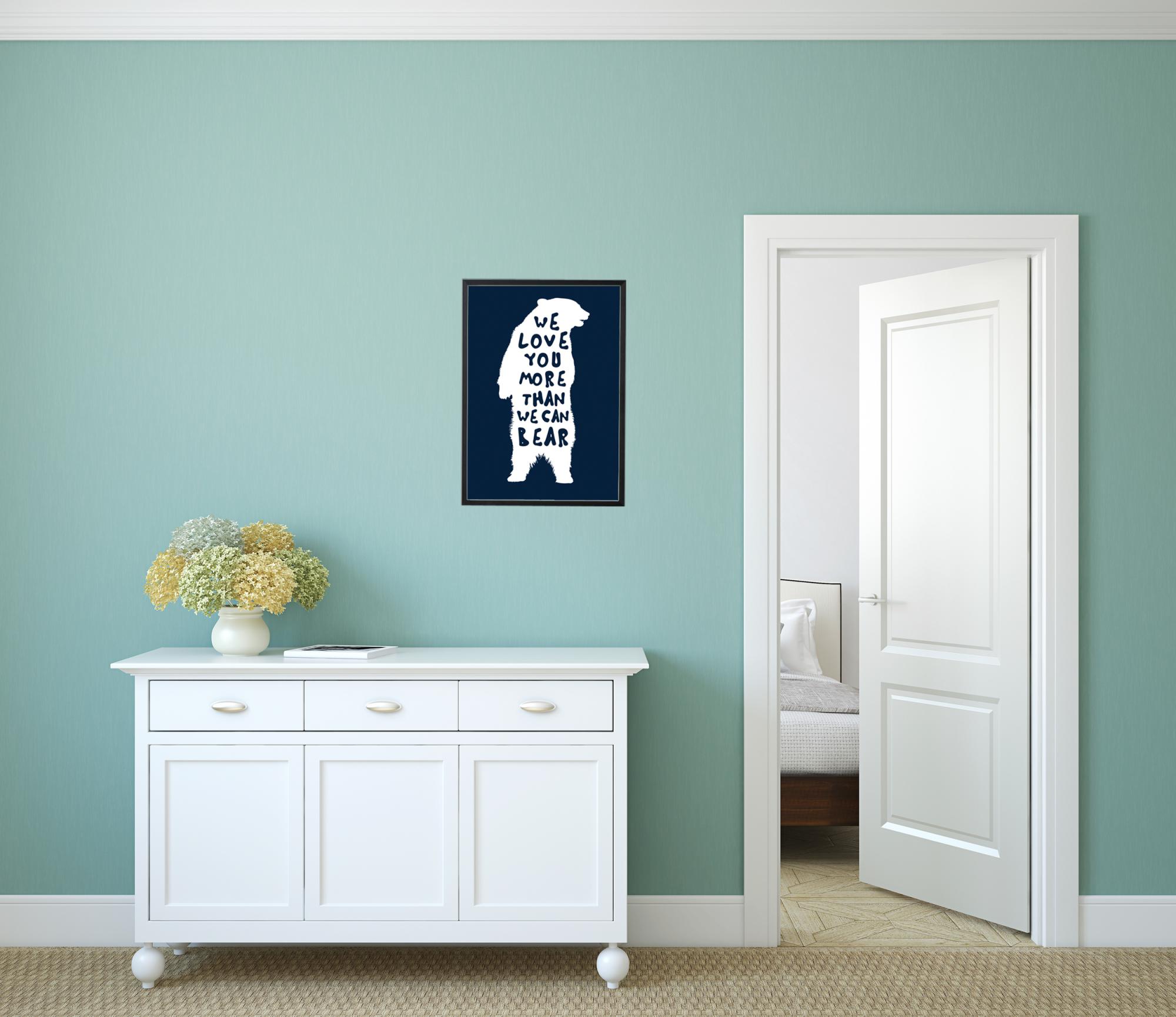 Ingénieuse et en même temps affectueuse affiche qui convient à ceux qui aiment particulièrement les ours. L'impression graphique est un beau cadeau à offrir à quelqu'un pour montrer son appréciation. Le poster a une silhouette d'ours en blanc contre un fond sombre et une typographie artistique blanche sur la citation. Encadrez le poster avec un cadre élégant et épuré qui s'intègre dans le reste de la décoration pour créer une sensation d'unité dans l'environnement.