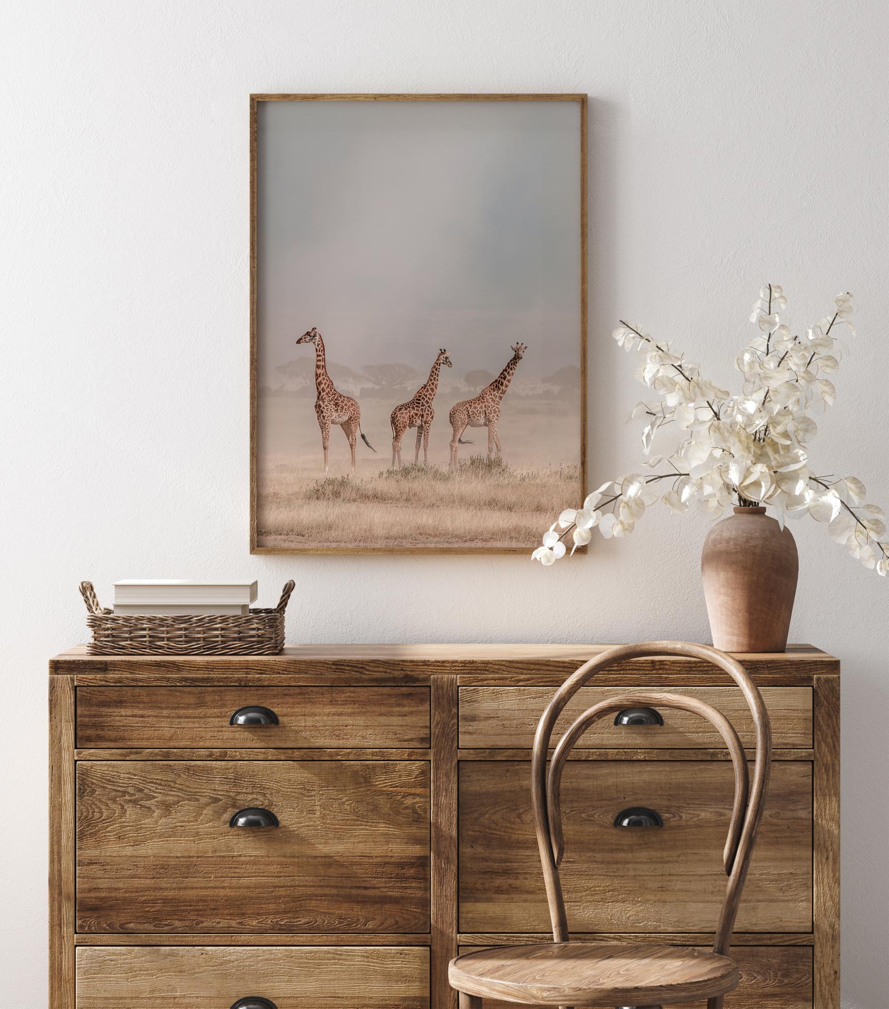 Une belle affiche d'animaux sauvages, trois girafes dans la savane africaine. Les girafes regardent dans différentes directions alors qu'elles affrontent les tourbillons de poussière d'Amboseli qui montent en spirale et créent un effet de brouillard. Visitez l'Afrique sans sortir de chez vous avec ce poster plein d'émotions.
