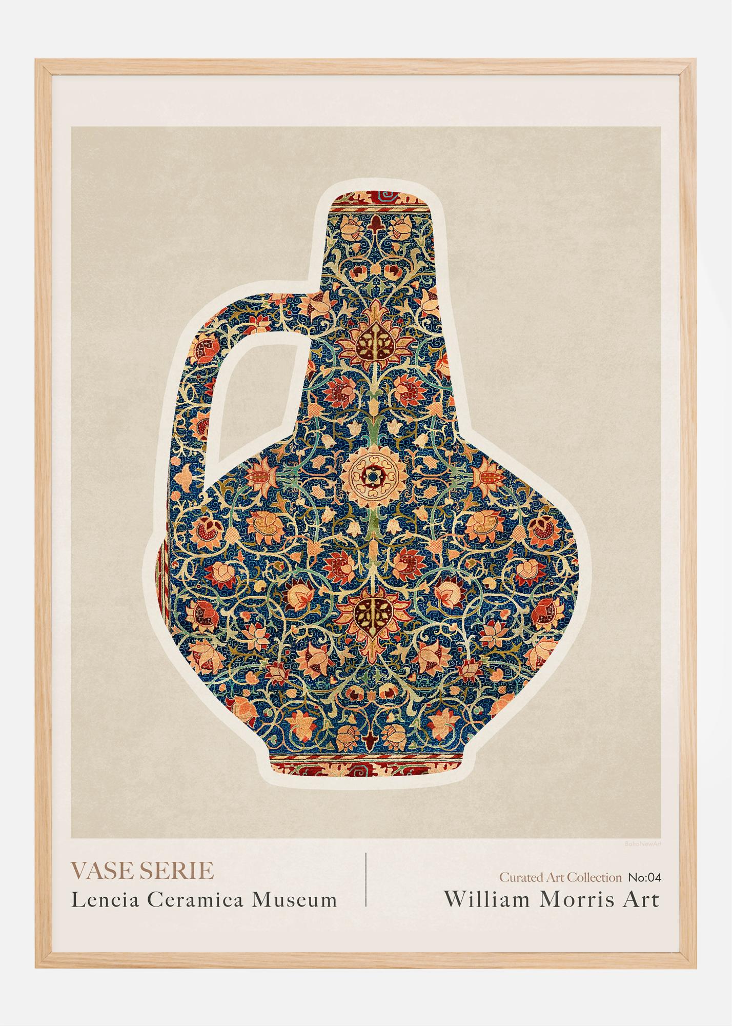Ce poster, qui est le numéro 04 de la "Curated Art Collection" du musée Lencia Ceramica, est un hommage riche et complexe à William Morris et à sa contribution significative à l'art du motif. Ici se présente un vase élégant, couvert d'un motif détaillé et coloré qui exprime la fascination de l'ère victorienne pour l'art oriental et médiéval, un style que Morris a contribué à populariser.