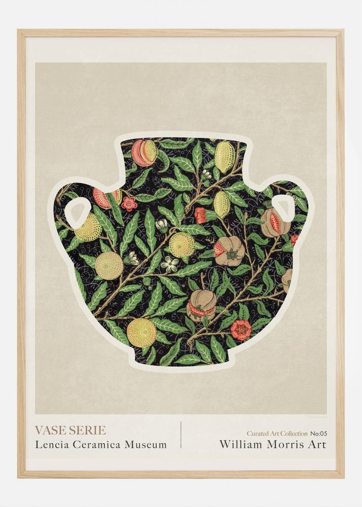 Dans cette affiche, numéro 05 de la "Curated Art Collection" au Lencia Ceramica Museum, nous revivons l'influence intemporelle de William Morris dans l'art et le design. L'œuvre présentée est un vase stylisé avec un design à motif complexe rempli d'un mélange envoûtant d'éléments botaniques et de motifs fruitiers, reflétant la passion de Morris pour la nature et sa capacité à tisser ensemble les formes naturelles dans son travail.