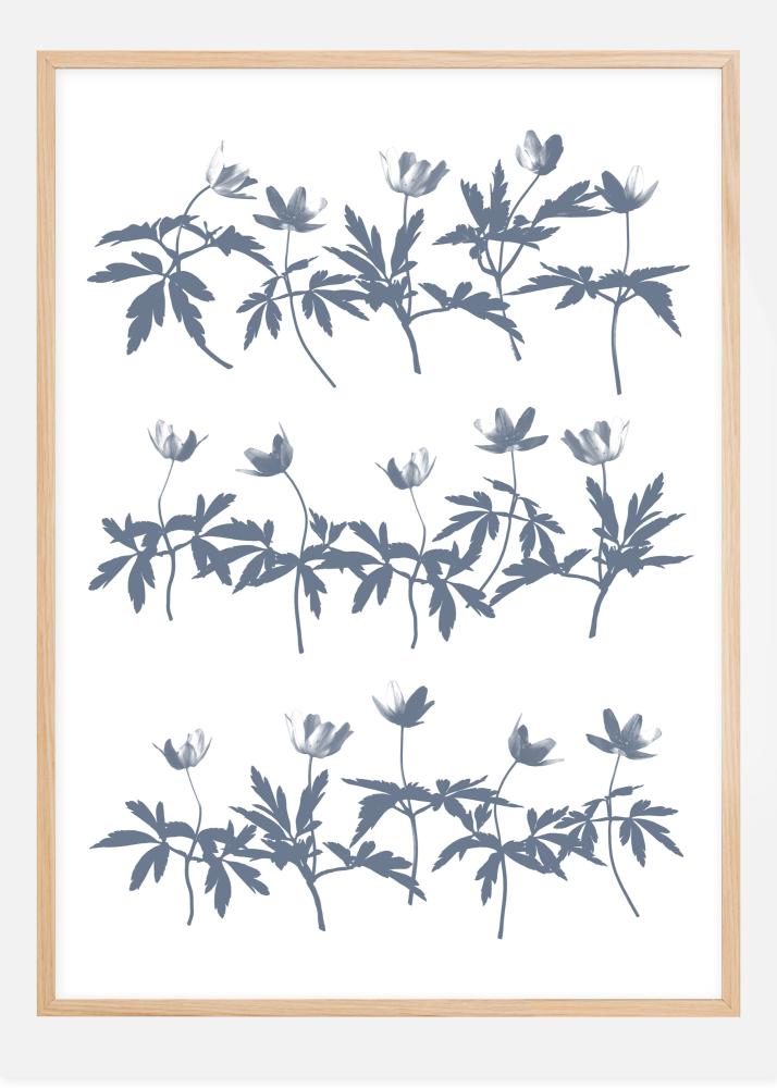 Un poster simple d'anémones de bois bleues dans un motif imprimé. Le motif se répète et constitue un joli ajout à un mur simple. Ce poster serait parfait dans une salle de bains pour refléter l'aspect aquatique de la pièce, sans être trop chargé.