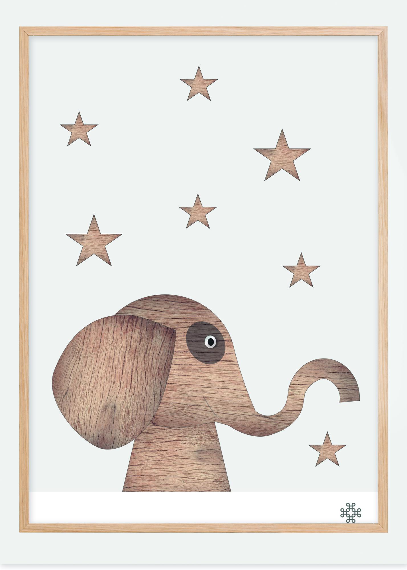 Un poster représentant un mignon éléphant en bois, entouré d'étoiles. L'éléphant est fait de planches de bois, ce qui lui donne un effet de texture. Les étoiles sont placées tout autour pour créer cette image excentrique. Elle serait la décoration parfaite et positive dans une chambre d'enfant.