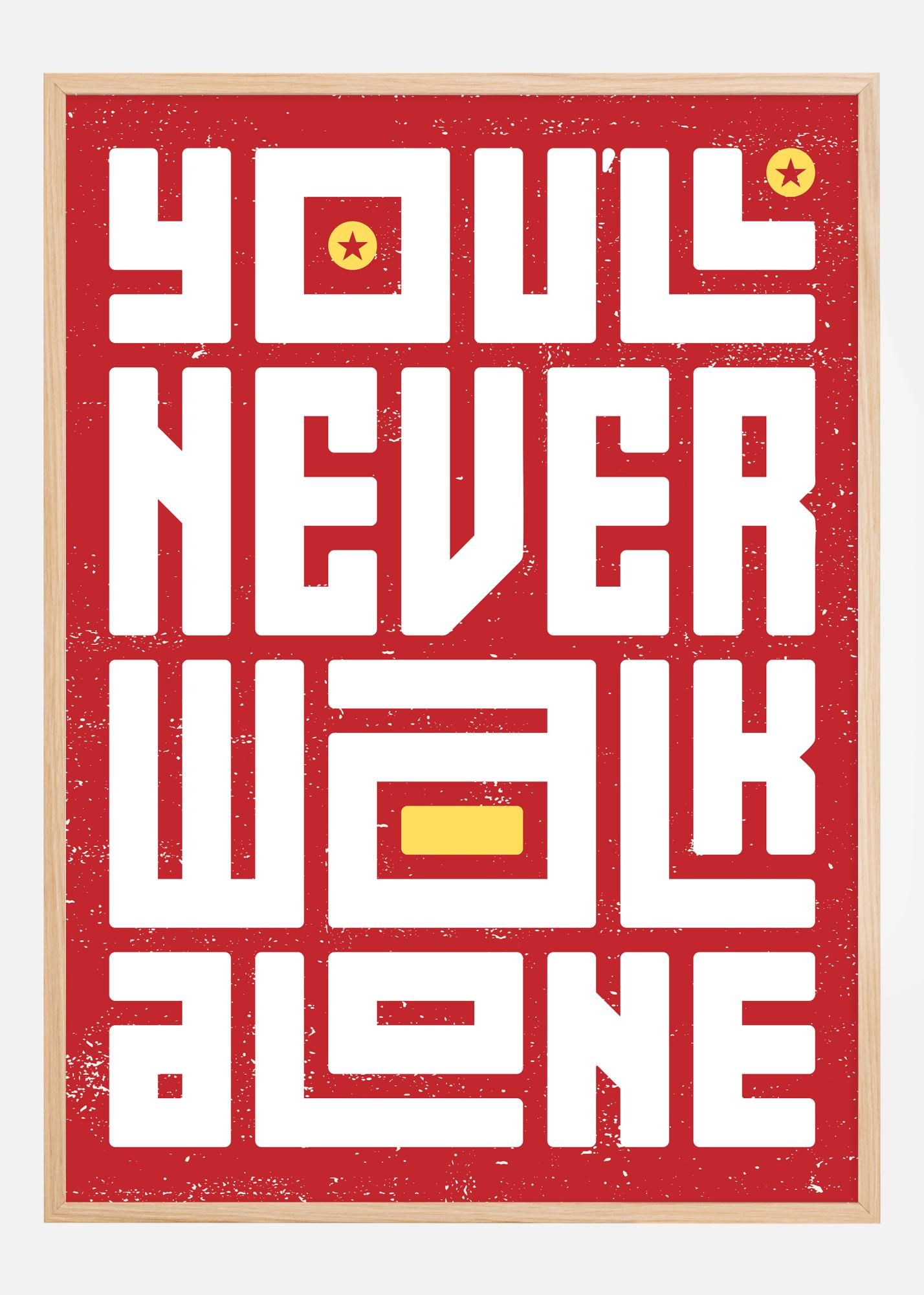 Cette affiche énergique et stimulante dégage une forte présence avec sa typographie audacieuse et massive qui met en avant le message "You'll Never Walk Alone" en lettres blanches éclatantes sur un fond rouge puissant. Les grandes lettres sont soigneusement agencées pour maximiser leur effet visuel et sont ornées d'étoiles dorées et d'une forme rectangulaire qui rompt le bloc de texte, ajoutant une dimension supplémentaire au design.
