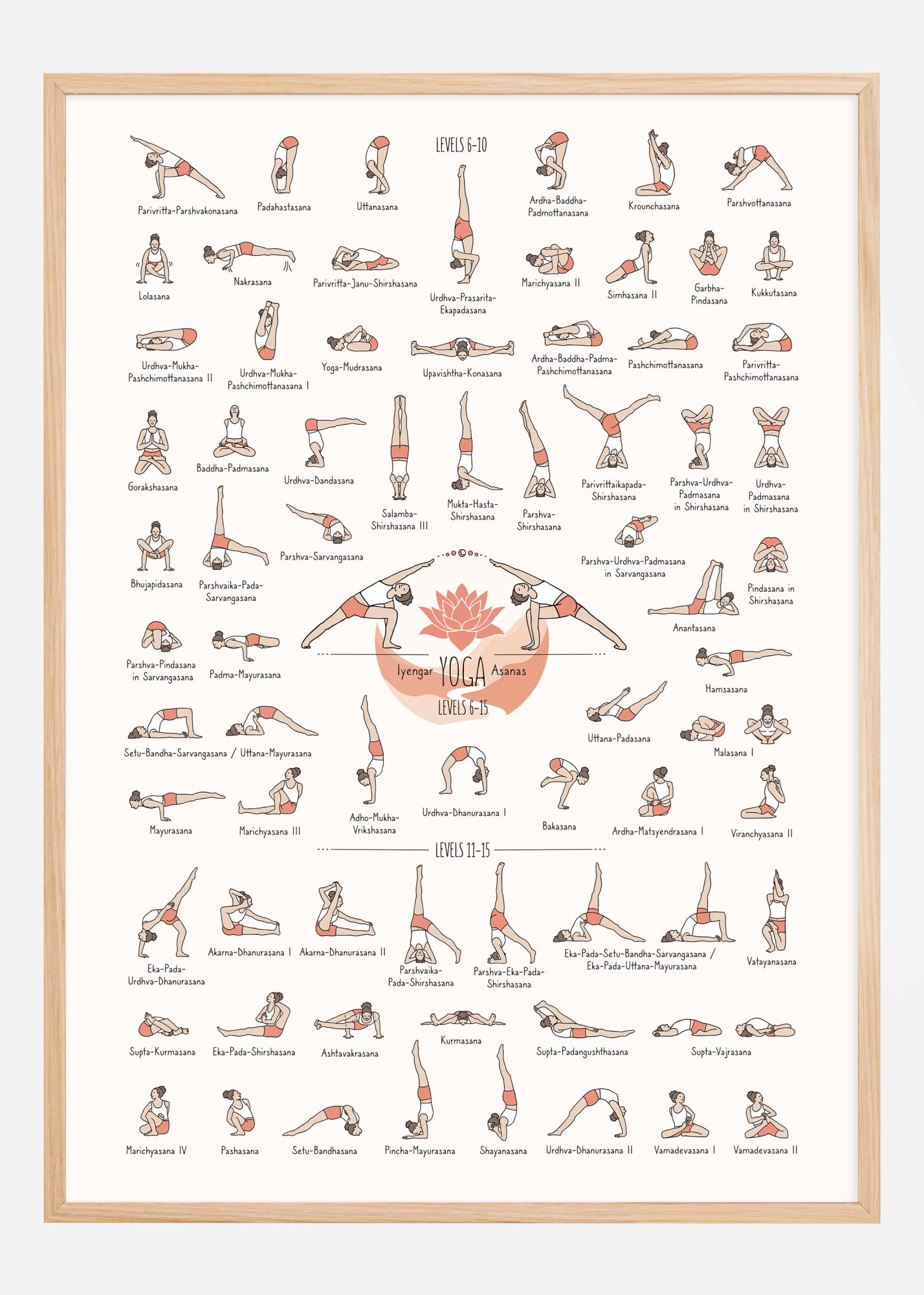 Ce poster de yoga détaillé et coloré illustre une collection complète d'asanas de yoga Iyengar du niveau 6 au niveau 15. Chaque posture de yoga est finement illustrée avec des couleurs chaudes et agréables qui mettent en valeur chaque forme et geste, tandis que les noms clairement identifiables à côté de chaque illustration facilitent le suivi et la pratique. Le design est à la fois fonctionnel et esthétique, créant une atmosphère accueillante pour les pratiquants de yoga de tous niveaux de compétence.