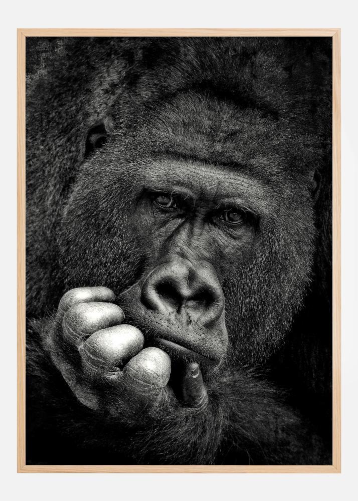 Un poster d'un gorille qui regarde devant lui. Le gorille fixe l'appareil photo d'un regard errant. Une main est repliée sous le menton, comme s'il réfléchissait à des questions importantes. L'impression en noir et blanc fait ressortir tous les détails du visage de ce grand singe, tout à fait incroyable.