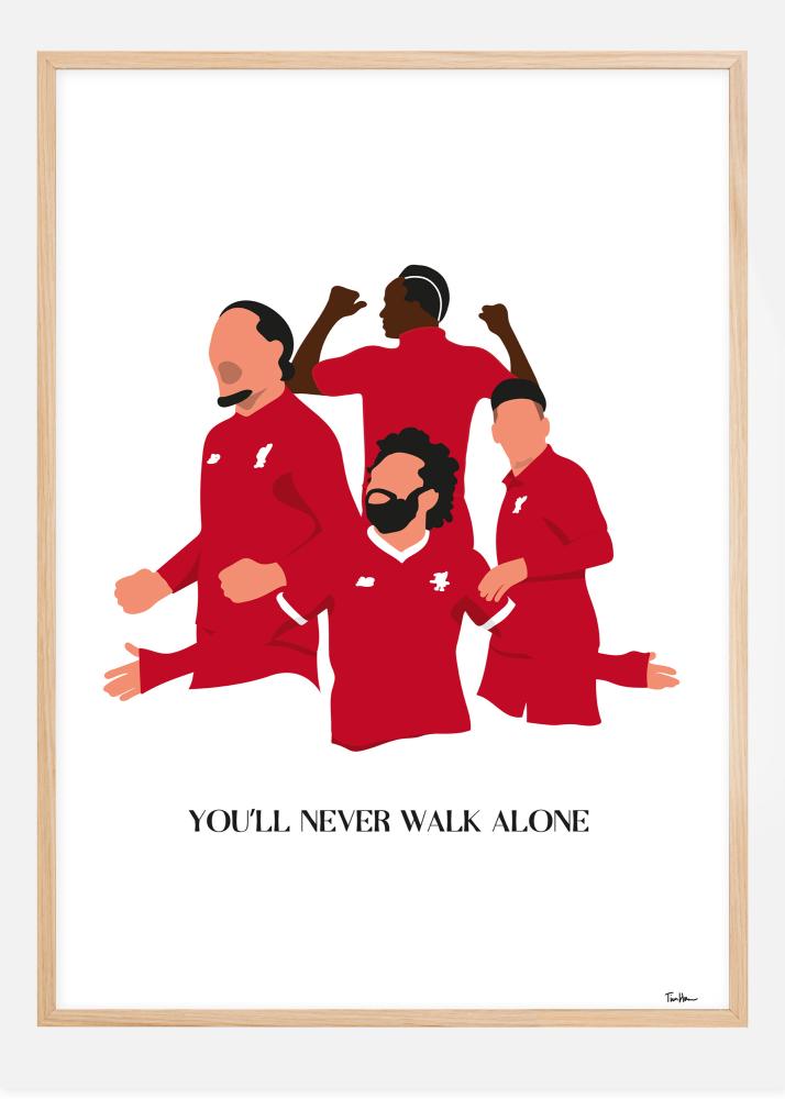 Un poster de football représentant quatre joueurs de l'équipe de Liverpool sous une forme stylisée dans leurs maillots rouges. Sous les joueurs, vous pouvez lire la devise du club " You'll Never Walk Alone ". C'est également une importante citation de vie, parfaite pour vous motiver chaque matin.