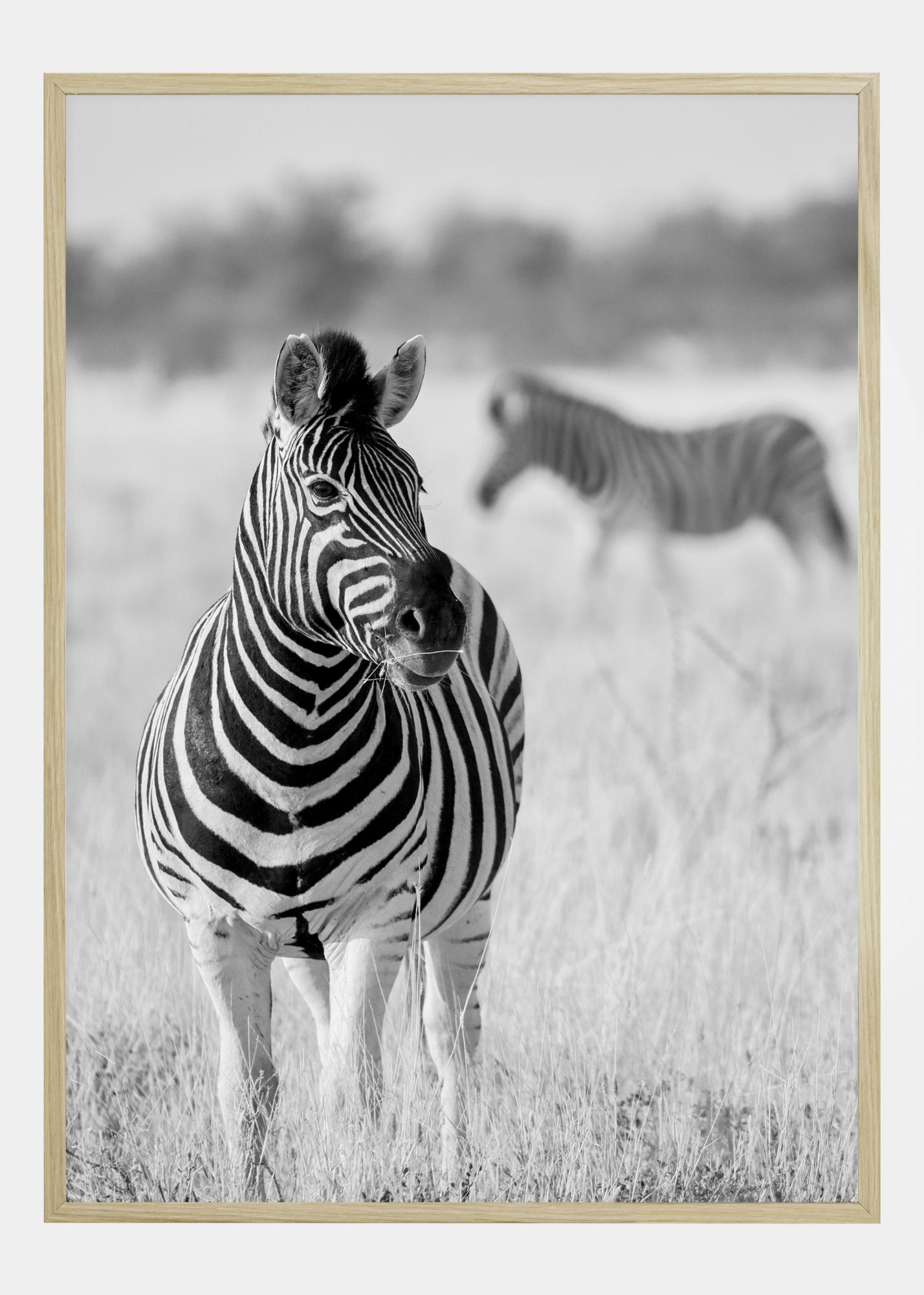Poster animalier représentant un zèbre dans les plaines africaines. Cet animal audacieux se tient en alerte au premier plan, tandis qu'un autre passe au loin. Un seul coup d'œil à cette affiche et Voyagerez en Afrique autant que vous le souhaitez.